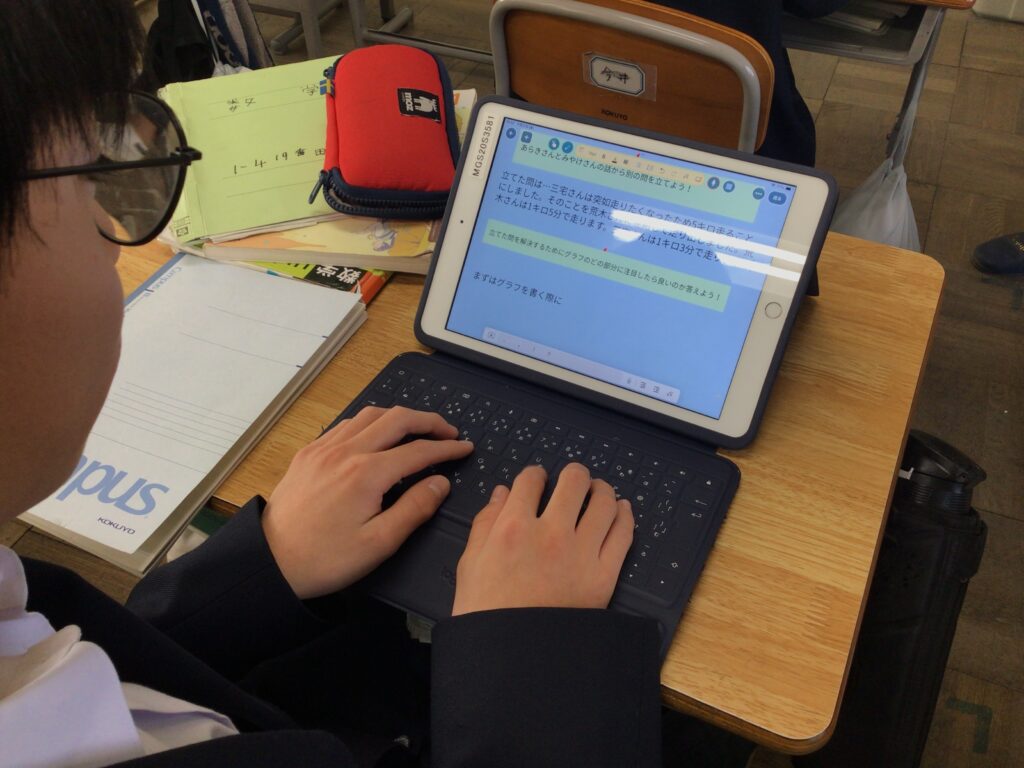 1年の数学科では、比例反比例の最後の授業で、 映像資料から問いを立てて問題を解決する課題を行いました。 課題解決のために ①映像資料の情報を読み取って問いを立てる ②未完成のグラフを作成する ③②を使って問題解決するためにはどこに注目したら良いのか説明する 子どもたちは、具体的な事象と数学的な表現を行き来しながら、 大切な点や注意点に気づくことができていました。 授業の最後には、このグラフを使って新たな問いを作成することにも挑戦しました。