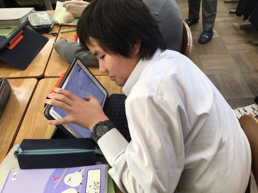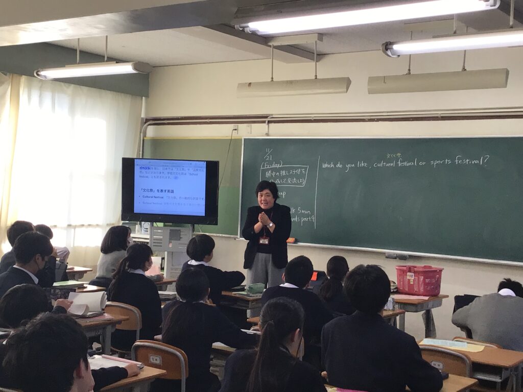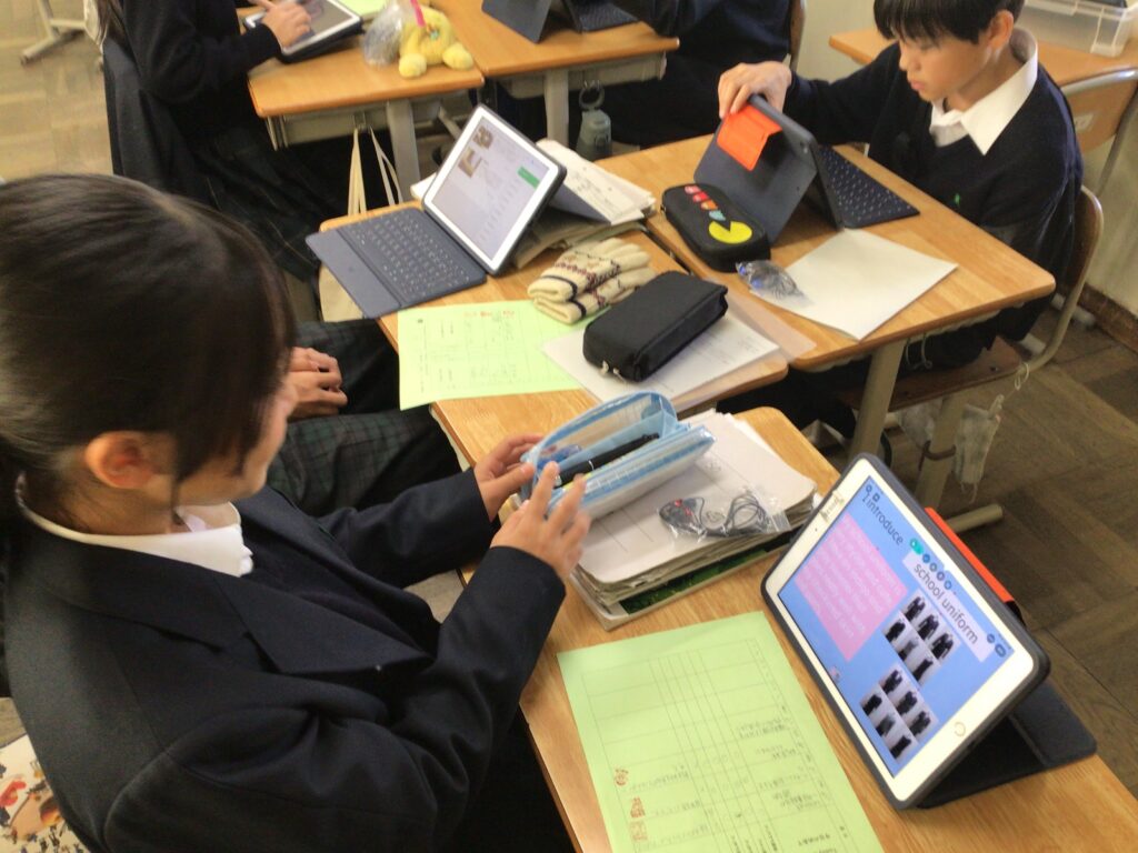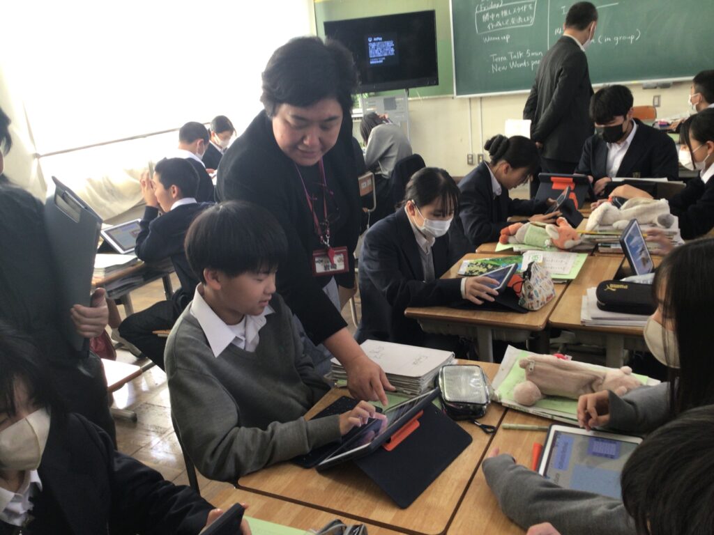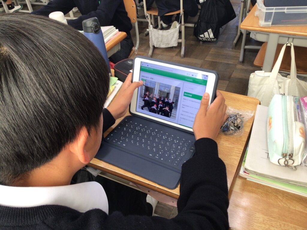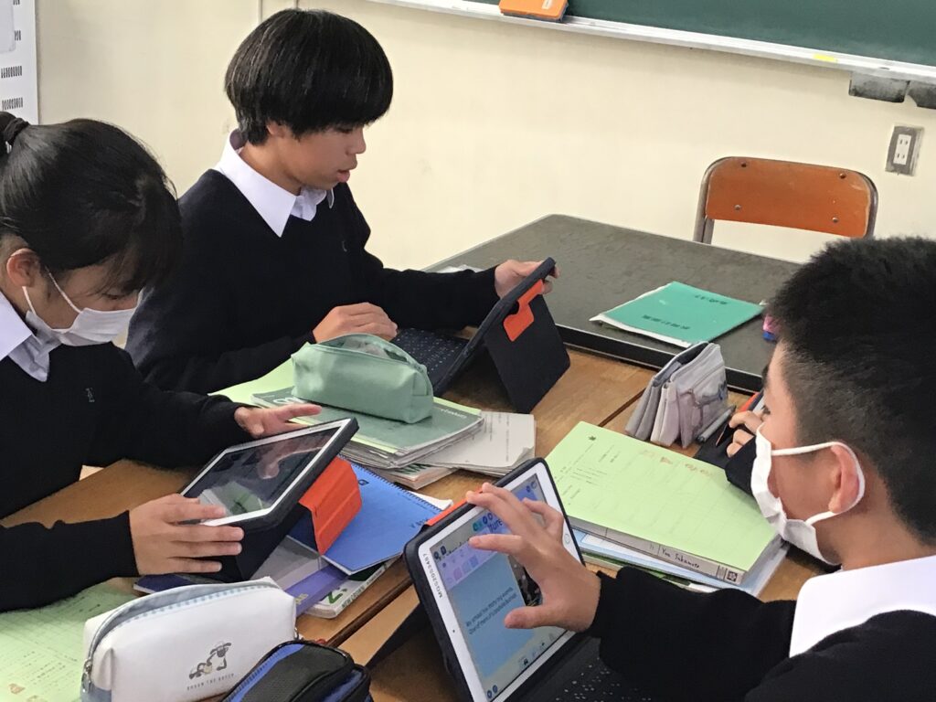 1年の英語の授業では、「勝中の良いところを紹介するためのスライドを作成しよう」 という課題設定のもとで、授業を行いました。この授業は、現在進行形や過去形を用いた 単元の最後に行われた授業で、日常的な話題について考えたことや感じたことを、 英語で書いた内容を、英語を用いて周りに伝えることがゴールの姿でした。 完成させたスライドをグループで紹介したあとで、改善点をアドバイスしあい、 さらに改良を加えたスライドが完成しました。 ここで作成したスライドは、12月に京都府内の他中学校との交流で活用されます。