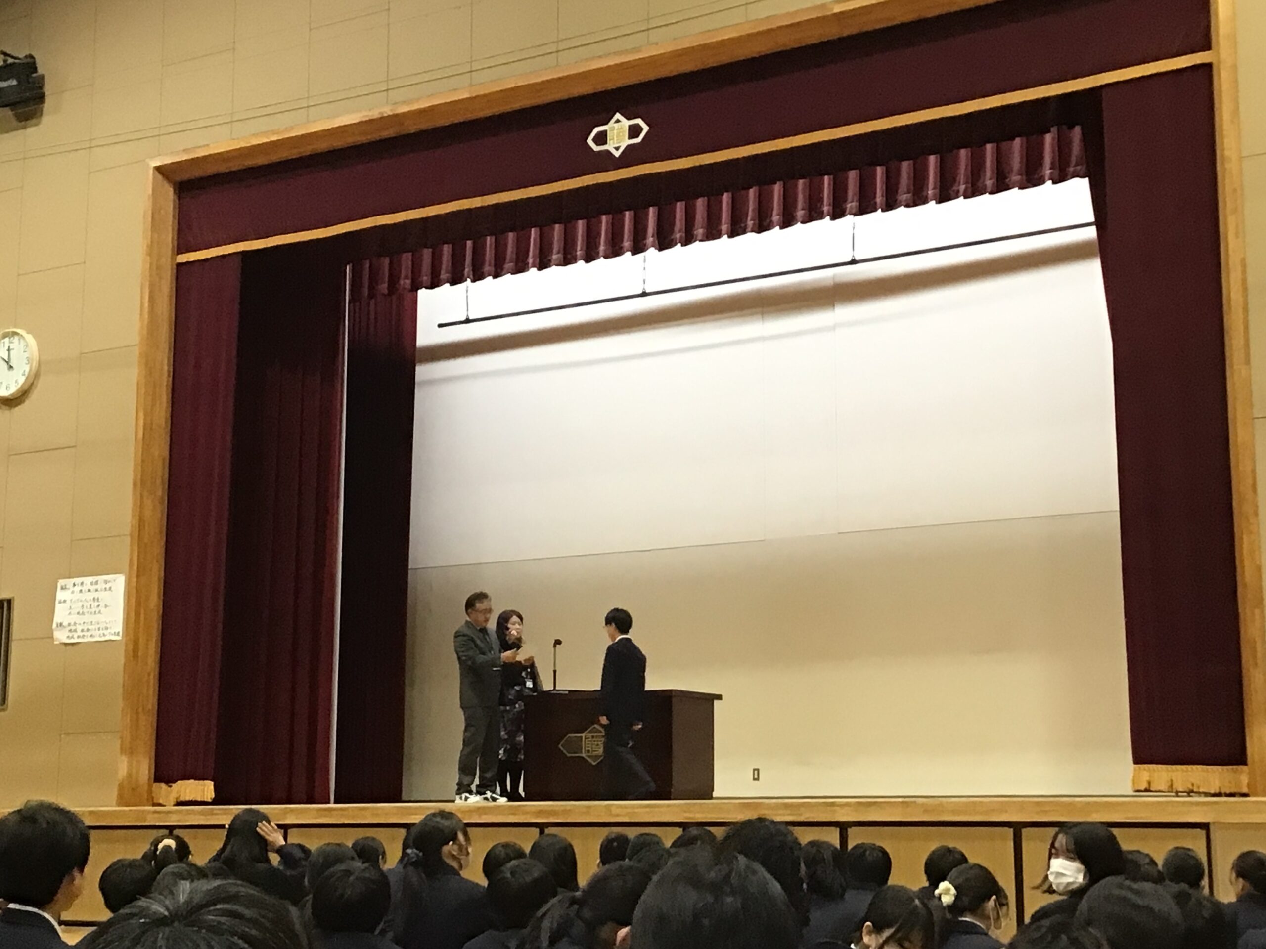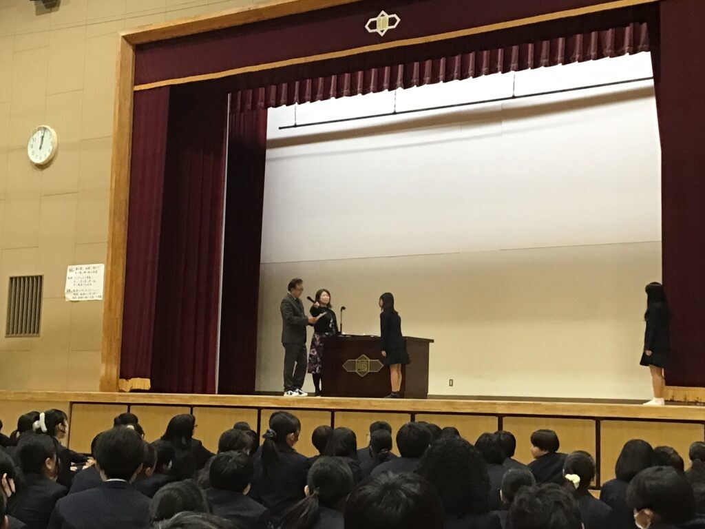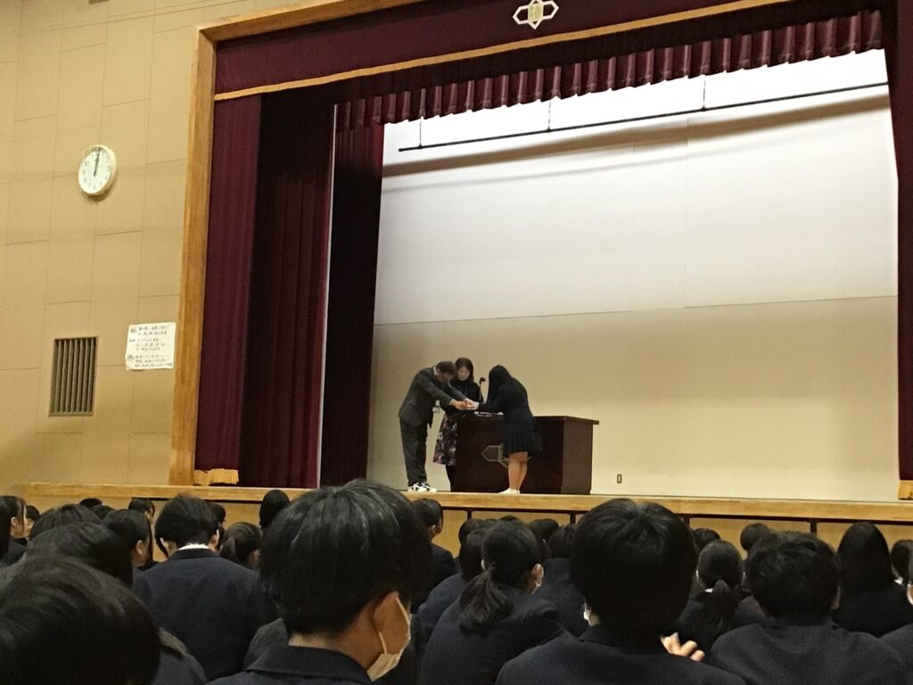 学校日誌11月28日の学活は、全校集会を開催しました。 生徒の主体的な学習発表を通して、自分自身の学習や生活を振り返り、 全員が新たな目標を見出すきっかけとすることをねらいとしました。 税の作文、社会を明るくする運動、向日市英語スピーチ大会の発表を聞き、 その後は、2学期での部活動や各種コンクールで表彰された生徒の表彰を行いました。 高い志を持った仲間の頑張りをみんなでたたえ合う1時間となりました。