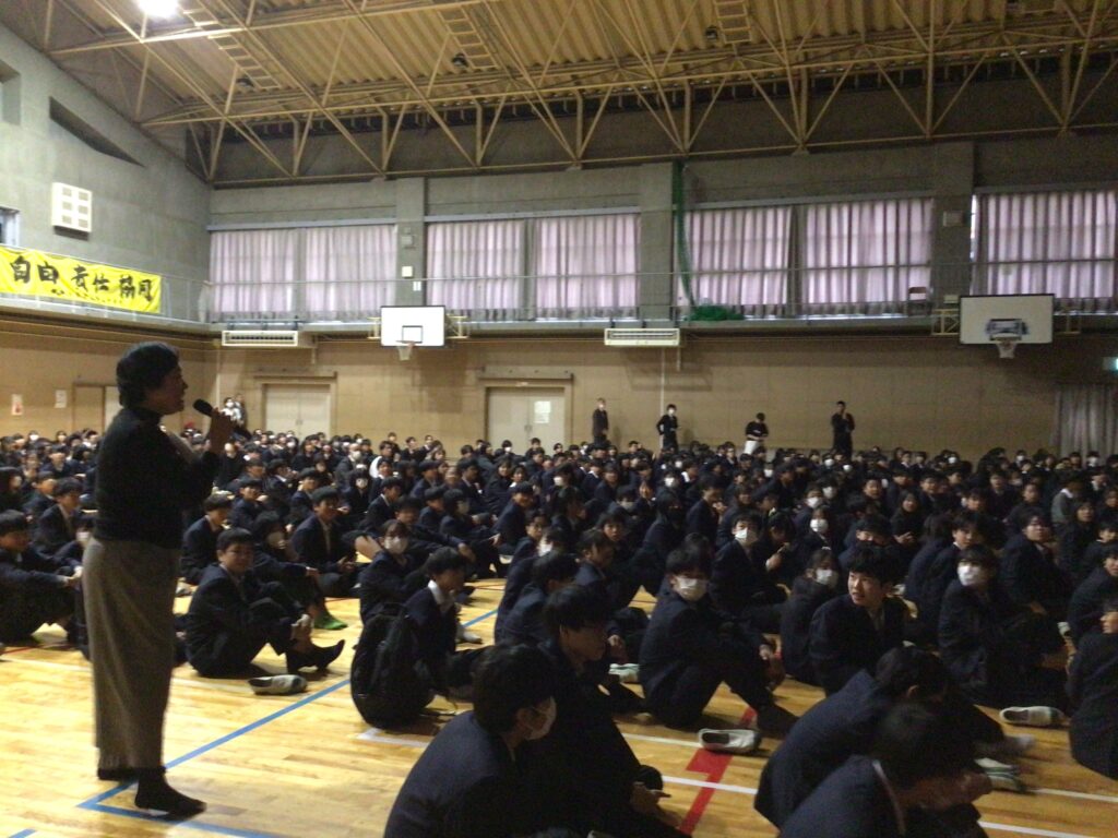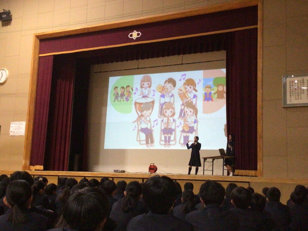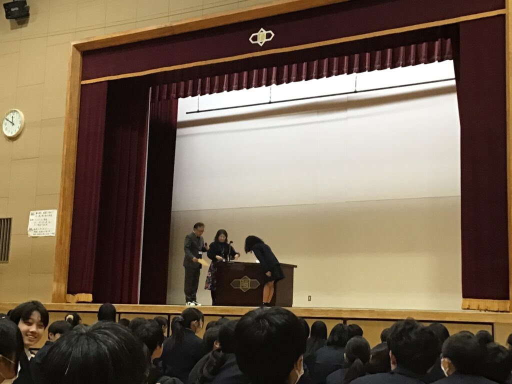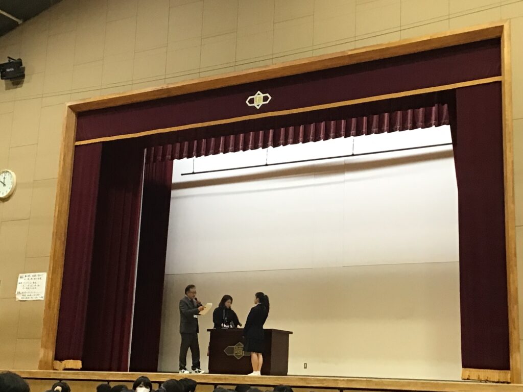 11月28日の学活は、全校集会を開催しました。 生徒の主体的な学習発表を通して、自分自身の学習や生活を振り返り、 全員が新たな目標を見出すきっかけとすることをねらいとしました。 税の作文、社会を明るくする運動、向日市英語スピーチ大会の発表を聞き、 その後は、2学期での部活動や各種コンクールで表彰された生徒の表彰を行いました。 高い志を持った仲間の頑張りをみんなでたたえ合う1時間となりました。