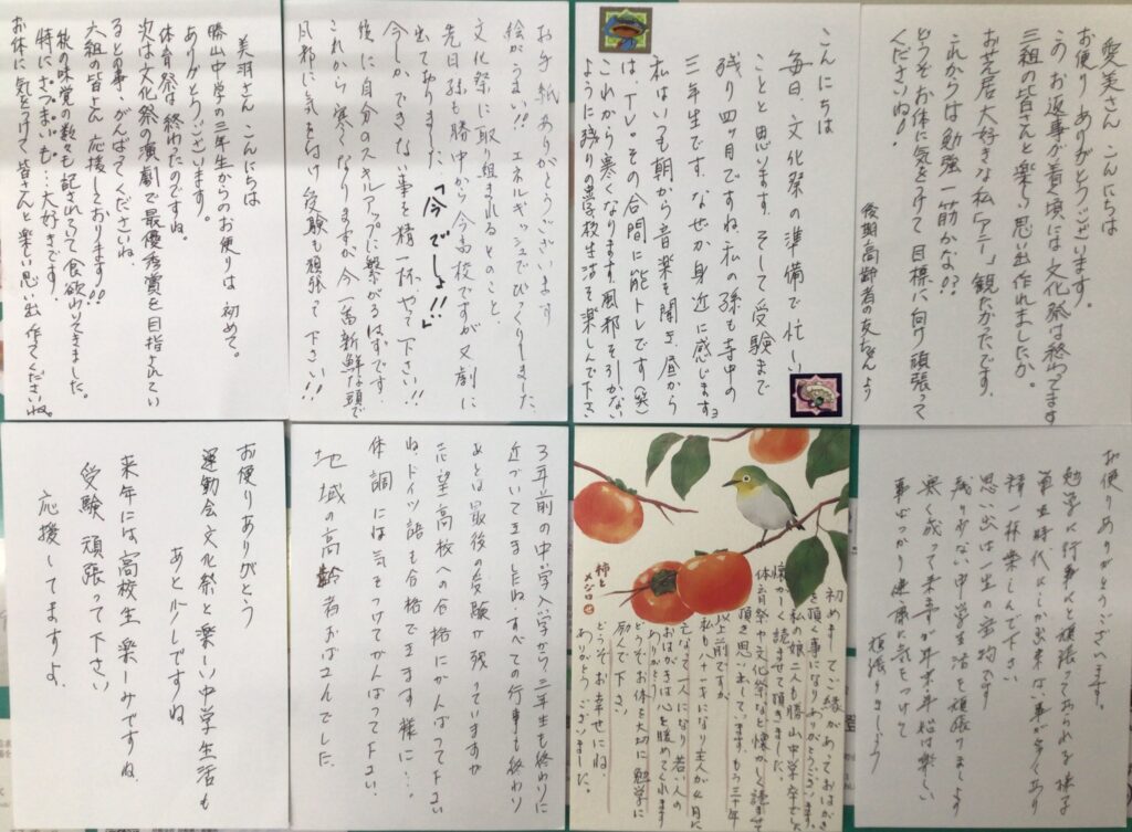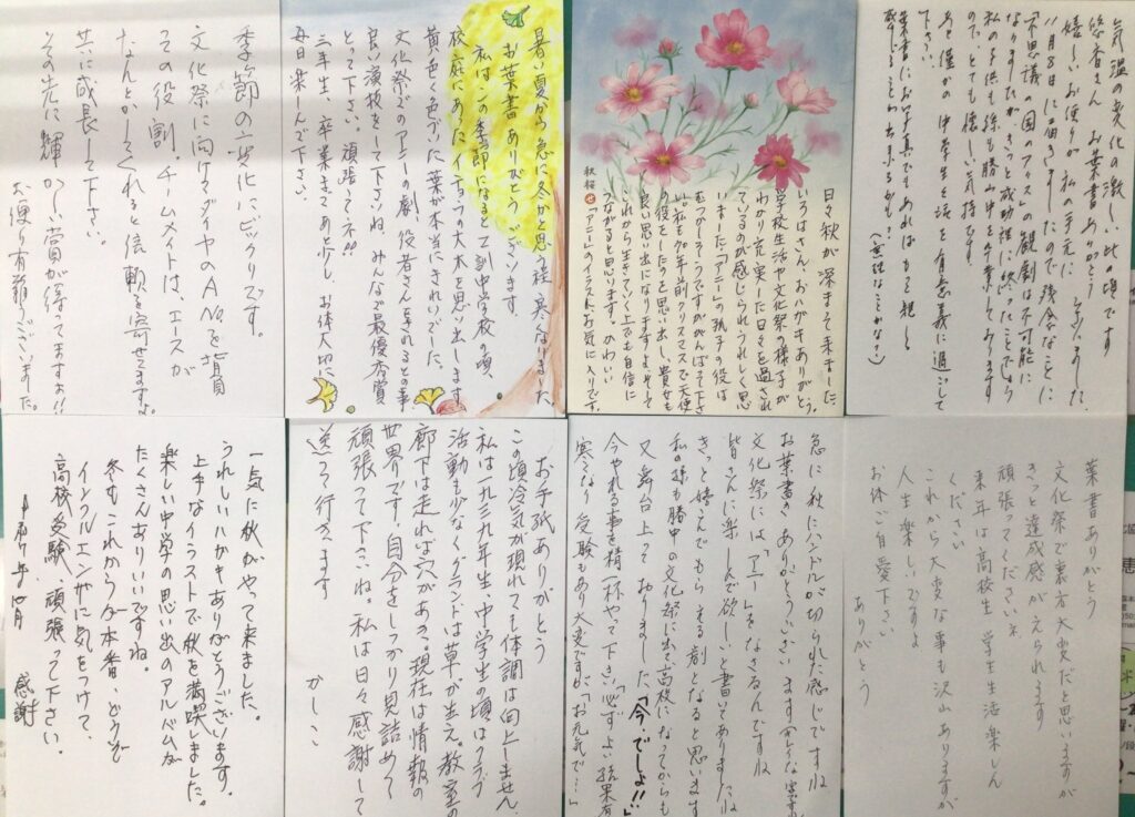 3年の国語の授業で作成したきずな便りは、 民生委員さんを通じて地域の高齢者の方々に届けられました。 その返事が3年生のみなさんのもとにたくさん届きました。 学校行事や受験に向けて頑張ってくださいと 地域の高齢者の方々からエールをいただきました。 心温まるお返事、ありがとうございました。