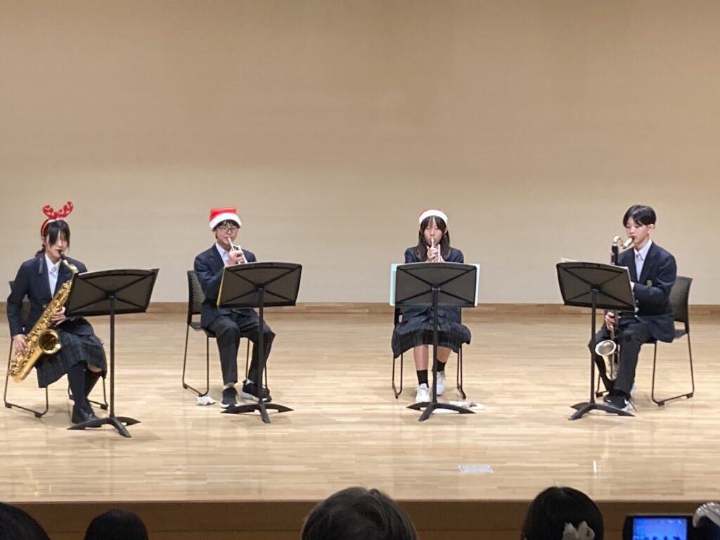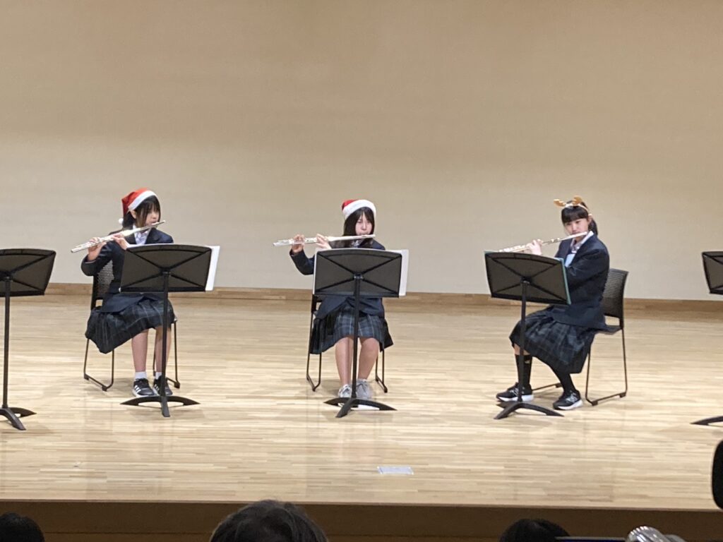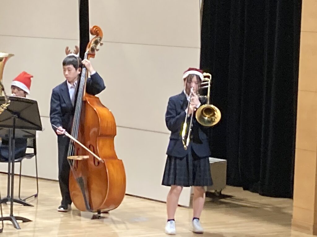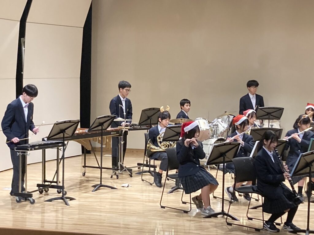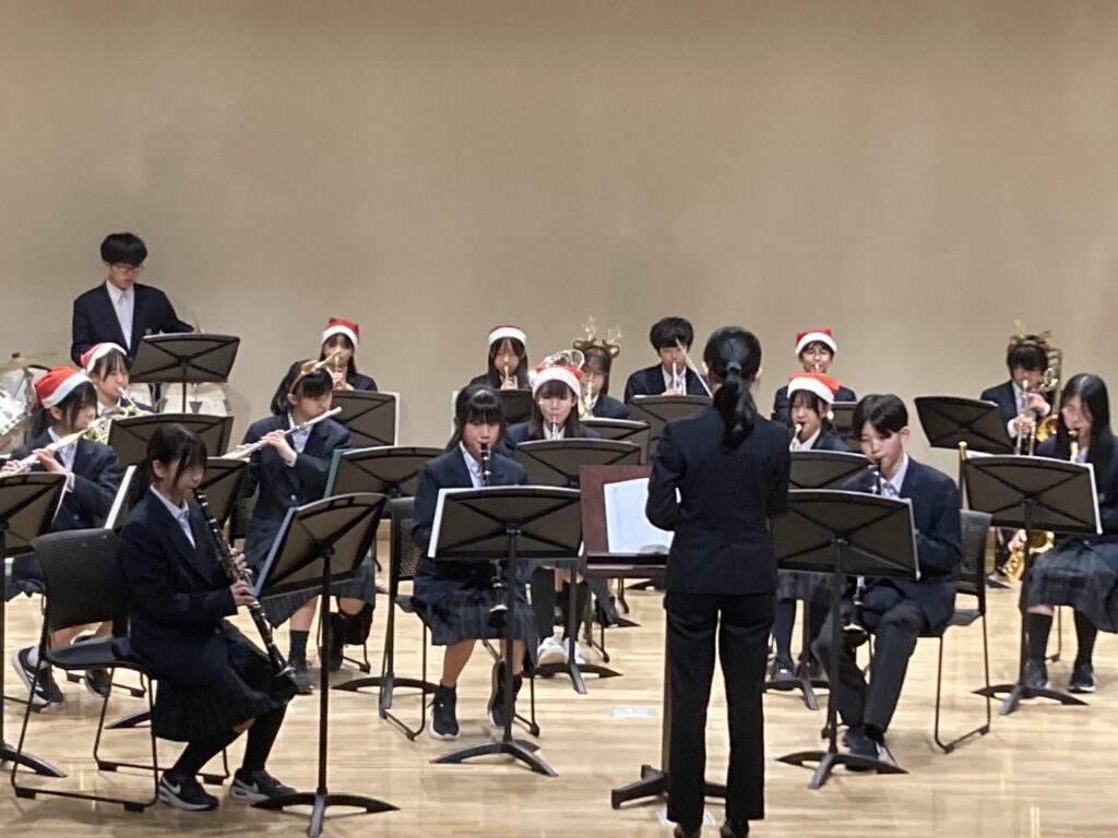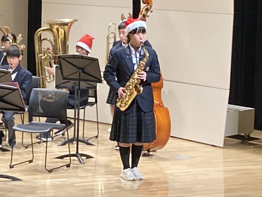 12月20日に永守重信市民会館にて、吹奏楽部のクリスマスコンサートが 開催されました。全体の合奏では、有名なアニメやクリスマスに ちなんだの曲の演奏があり、パートごとに分かれての演奏では、 それぞれのパートで練習してきた曲を思いを込めて演奏しました。 また、観客はそれぞれのパートに投票をしました。 最優秀パートは年明けに顧問より発表されるそうです。 今年も吹奏楽部はたくさんの場面で演奏を行い、見に来た人たちを 明るく元気にしてくれました。本当にお疲れさまでした。