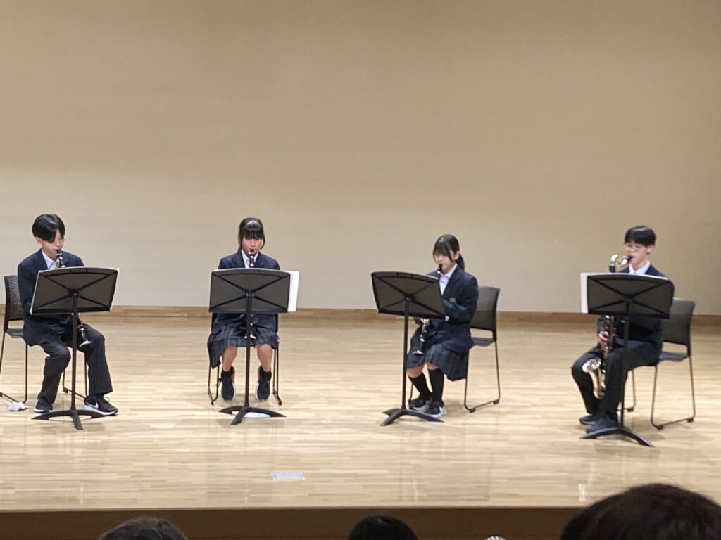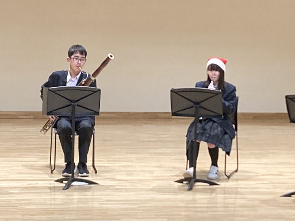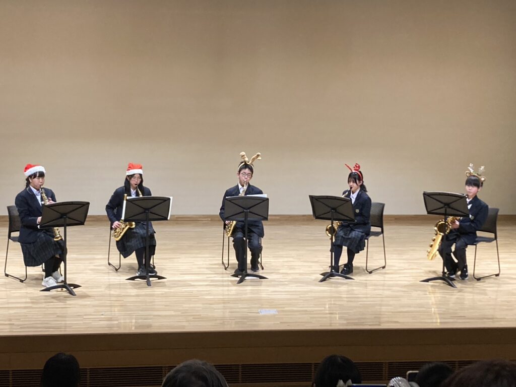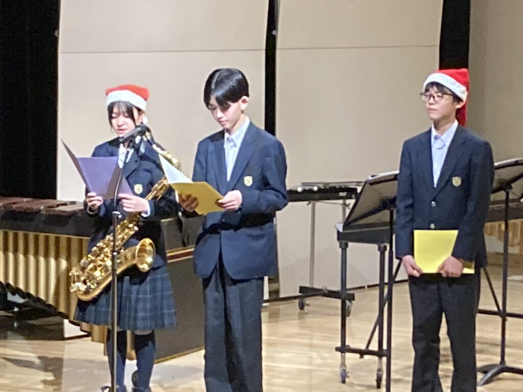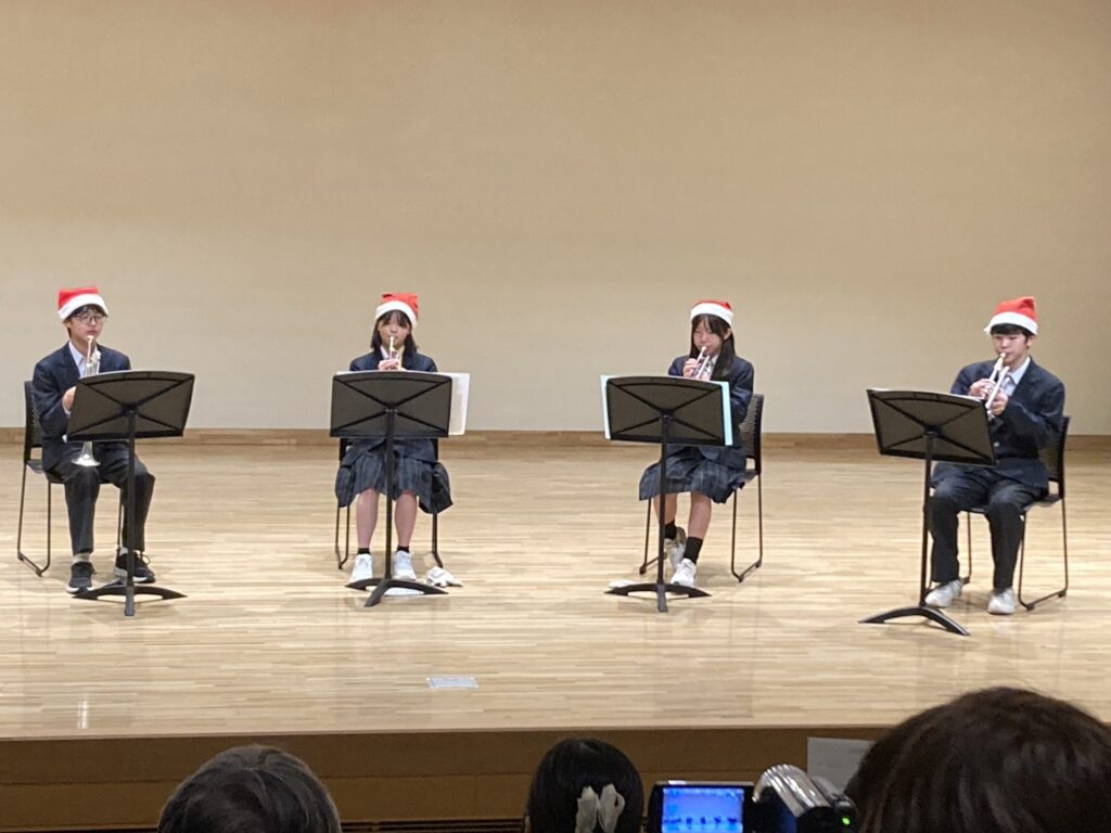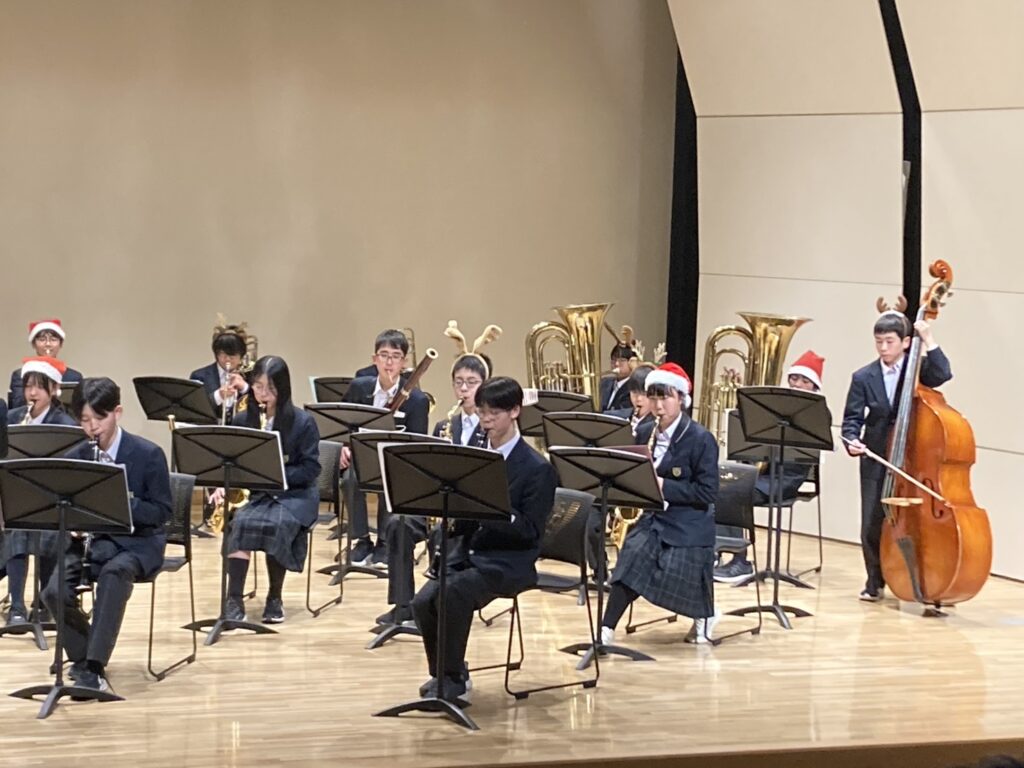 12月20日に永守重信市民会館にて、吹奏楽部のクリスマスコンサートが 開催されました。全体の合奏では、有名なアニメやクリスマスに ちなんだの曲の演奏があり、パートごとに分かれての演奏では、 それぞれのパートで練習してきた曲を思いを込めて演奏しました。 また、観客はそれぞれのパートに投票をしました。 最優秀パートは年明けに顧問より発表されるそうです。 今年も吹奏楽部はたくさんの場面で演奏を行い、見に来た人たちを 明るく元気にしてくれました。本当にお疲れさまでした。