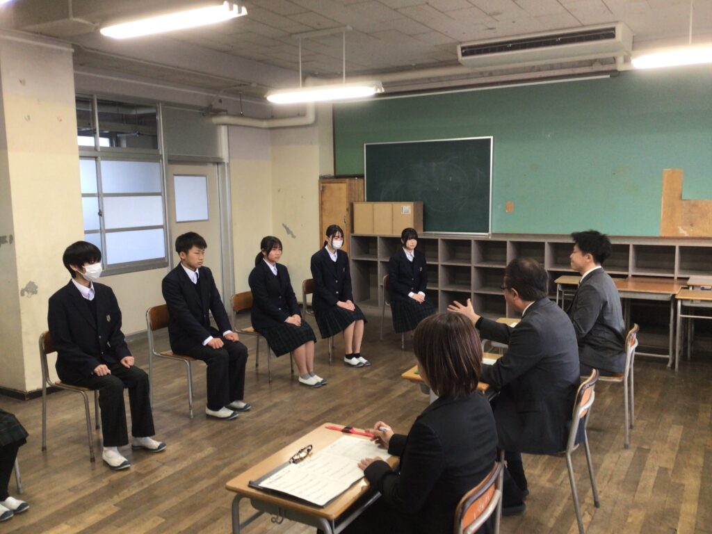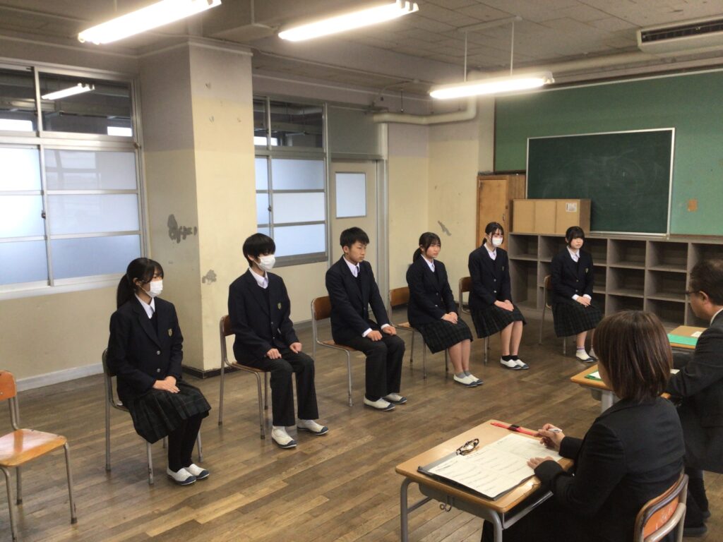 20日は、3年2組の模擬面接でした。 2組では、みなさんの「夢」を聞かれる場面が多くあり、 もっと勉強に励んで担任の先生のような中学校の数学の先生に なりたいと答える一幕があったようです。 また、自分の思いを答えることを苦手としていた時も、 校長先生の質問に対して、「じっくり考えてから答えていいですか」と 熟考して答える場面もあったようで、 入試本番に向けて充実した模擬面接となったようです。