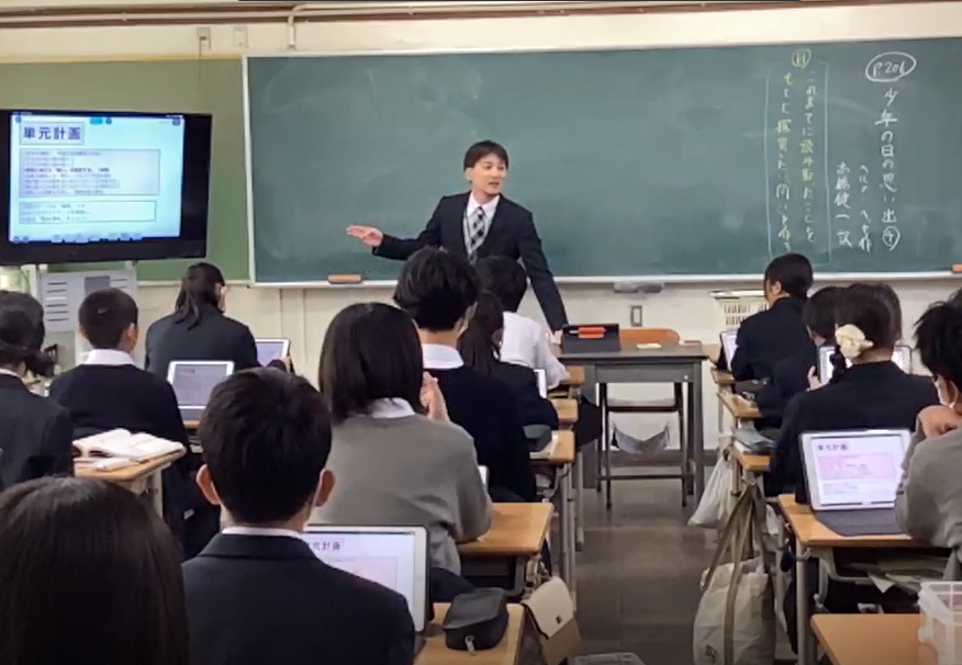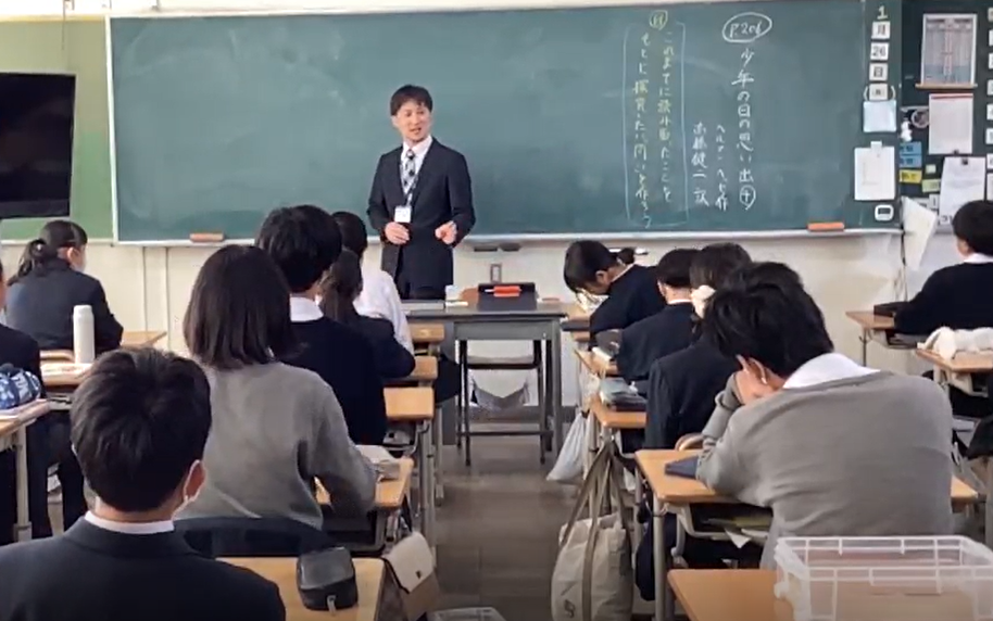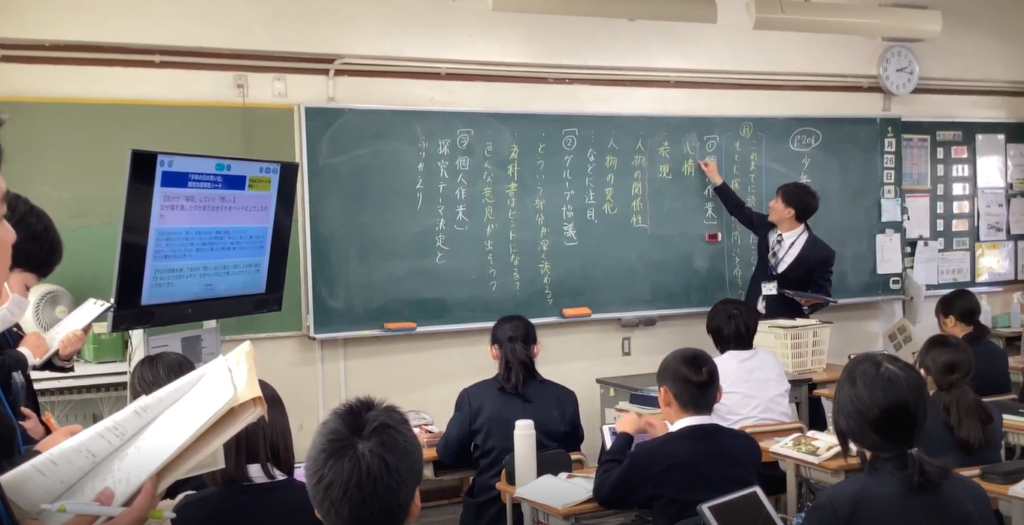 学校日誌1年の国語科の授業では、「少年の日の思い出」の題材を読んで、 登場人物の心情や表現の変化に着目して、自らの関心に基づいた 「問い」を立てました。教師が与える「問い」ではなく、 生徒自らが興味・疑問を持った「問い」を立て、グループで共有することで 自分では思いつかなかった仲間の視点に触れることで、刺激を受けて 自分で立てた「問い」の理由をブラッシュアップさせていました。