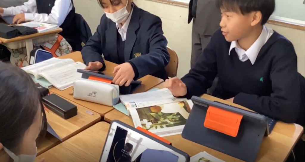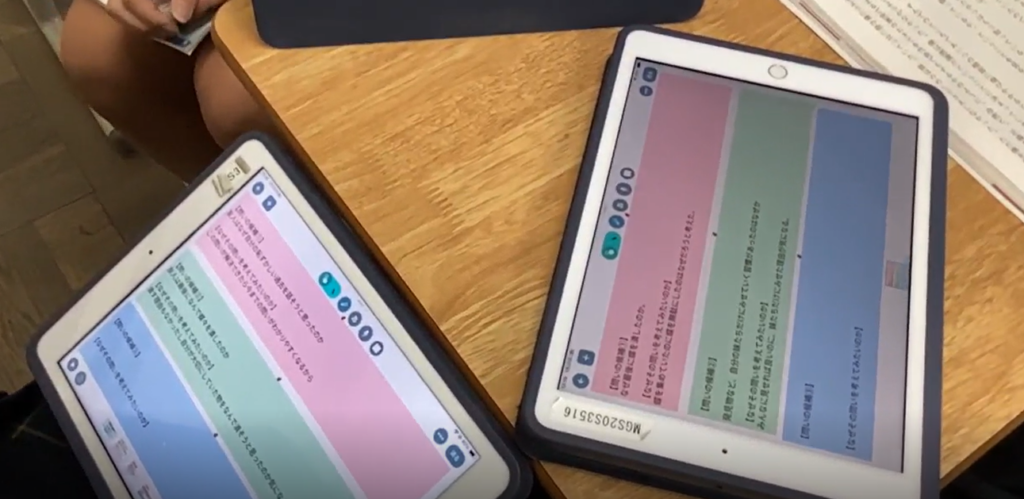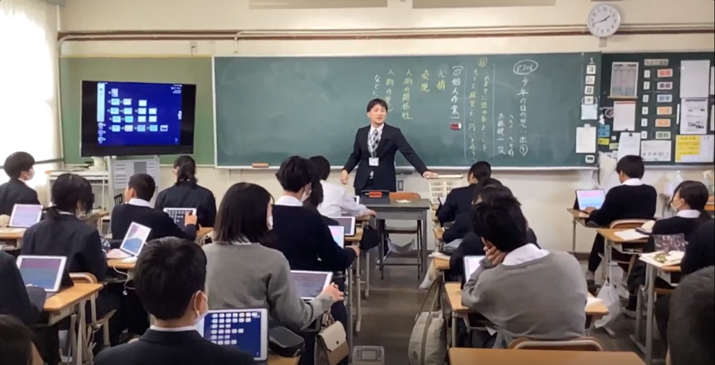 1年の国語科の授業では、「少年の日の思い出」の題材を読んで、 登場人物の心情や表現の変化に着目して、自らの関心に基づいた 「問い」を立てました。教師が与える「問い」ではなく、 生徒自らが興味・疑問を持った「問い」を立て、グループで共有することで 自分では思いつかなかった仲間の視点に触れることで、刺激を受けて 自分で立てた「問い」の理由をブラッシュアップさせていました。