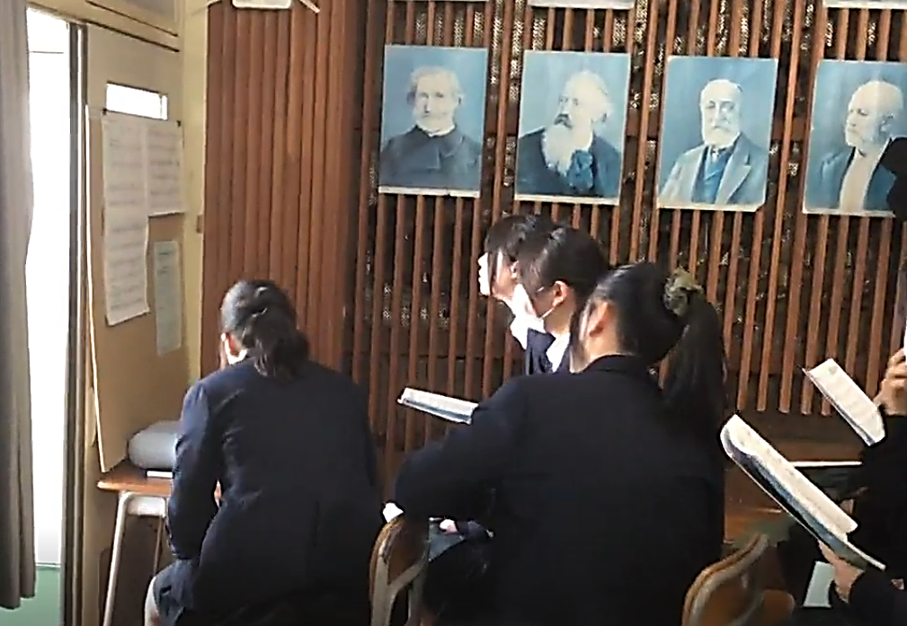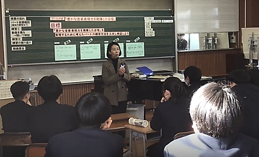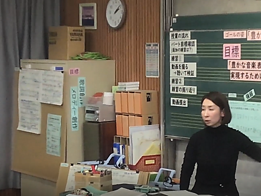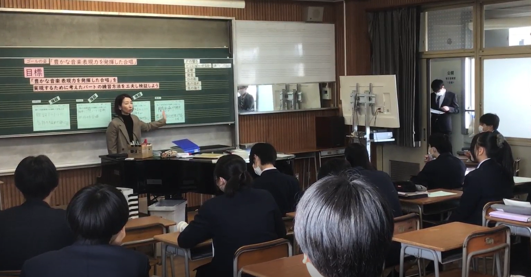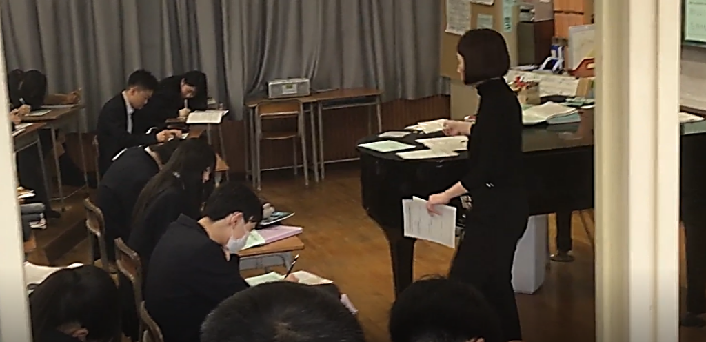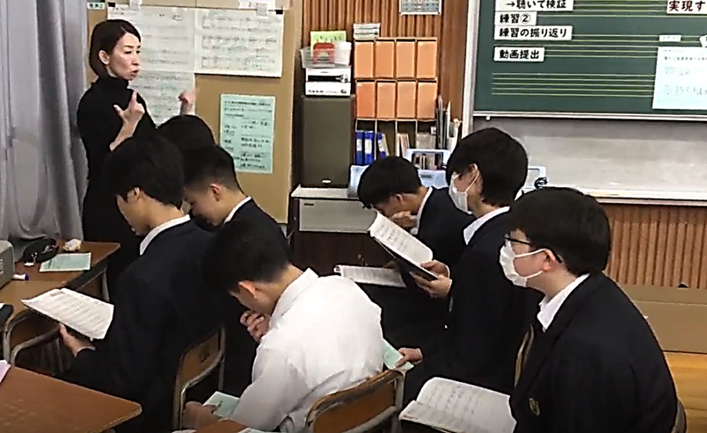 3年の音楽の授業では、卒業式の定番曲「旅立ちの日に」に取り組んでいます。 中学校生活の集大成とも言えるこの曲を、単に音程を合わせて歌うことではなく、 「豊かな音楽表現力」をテーマに、一音一音に特別な思いを込めて向き合いました。 各パートで「今日はどんな表現を目指すのか」 「そのためにどんな練習方法が有効か」を生徒自身が考え、自分たちで創り上げました。 パート練習では、「もう少し強弱をつけた方がいい」 「発音や息継ぎをこうしてみよう」と、互いに意見を出し合うのはもちろんのこと、 他クラスの同じパートで書かれた改善点のシートも参考にしながら、 新たな気づきや工夫を書き込んで、自分たちの表現が着実に進化している 「成長の跡」が見て取ることができました。 授業の最後で響かせたハーモニーは、 卒業式本番で「豊かな音楽表現力」を発揮した歌声が 体育館に響き渡るであろう素晴らしい合唱となりました。