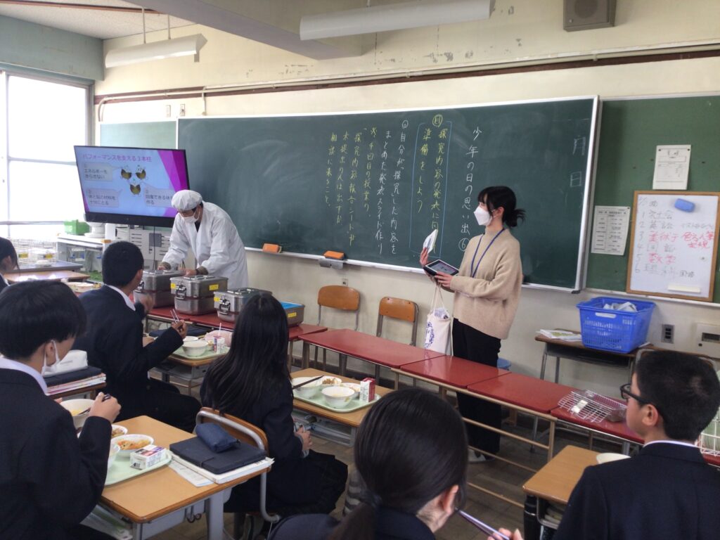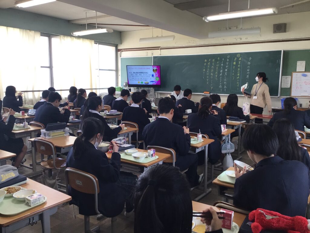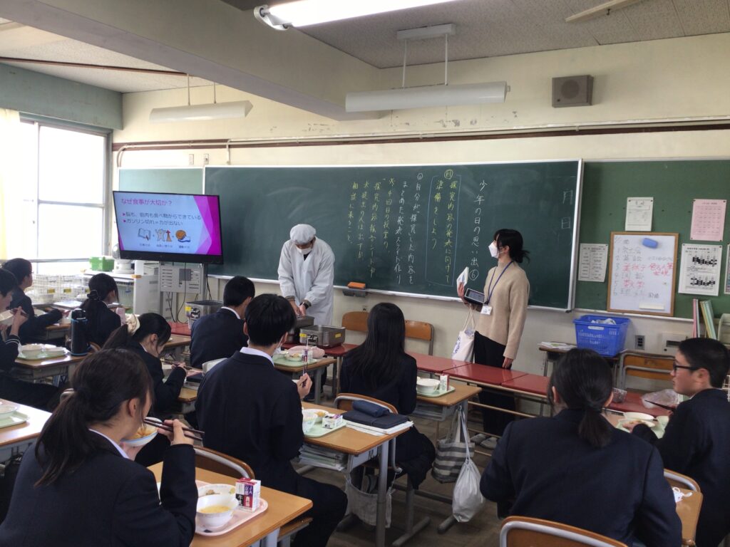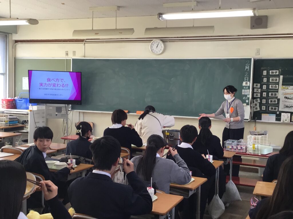 2月2日に、向日市学校給食センターの先生をお招きして 給食指導(食育)」の授業を実施しました。 テーマは「食べ方で、実力が変わる!?」 ~実力を発揮するための食生活のポイント~です。 勉強や部活動など、中学校生活でしっかりと自分の力を発揮するためには、 毎日の食事がどれほど大切かについて、 専門的な視点から分かりやすく教えていただきました。 これからさらに体も心も大きく成長していく中学生の時期、 今回学んだ「食の知識」は、自分の体を守り、高めていくための一生の財産になります。 日々の給食に感謝しながら味わって美味しく食べてくださいね。