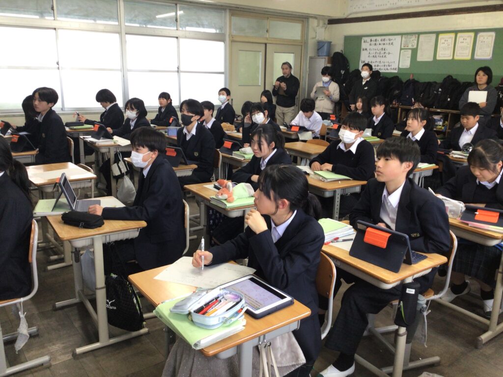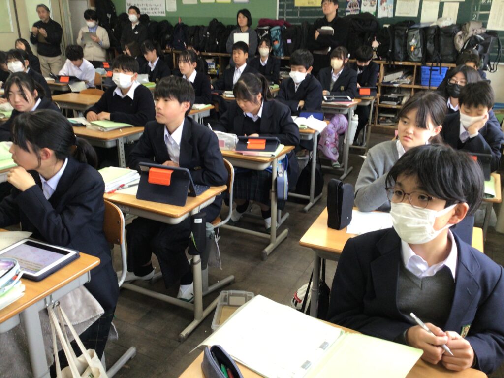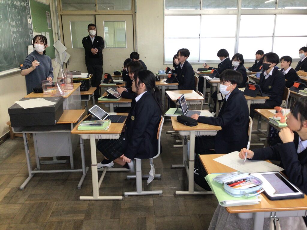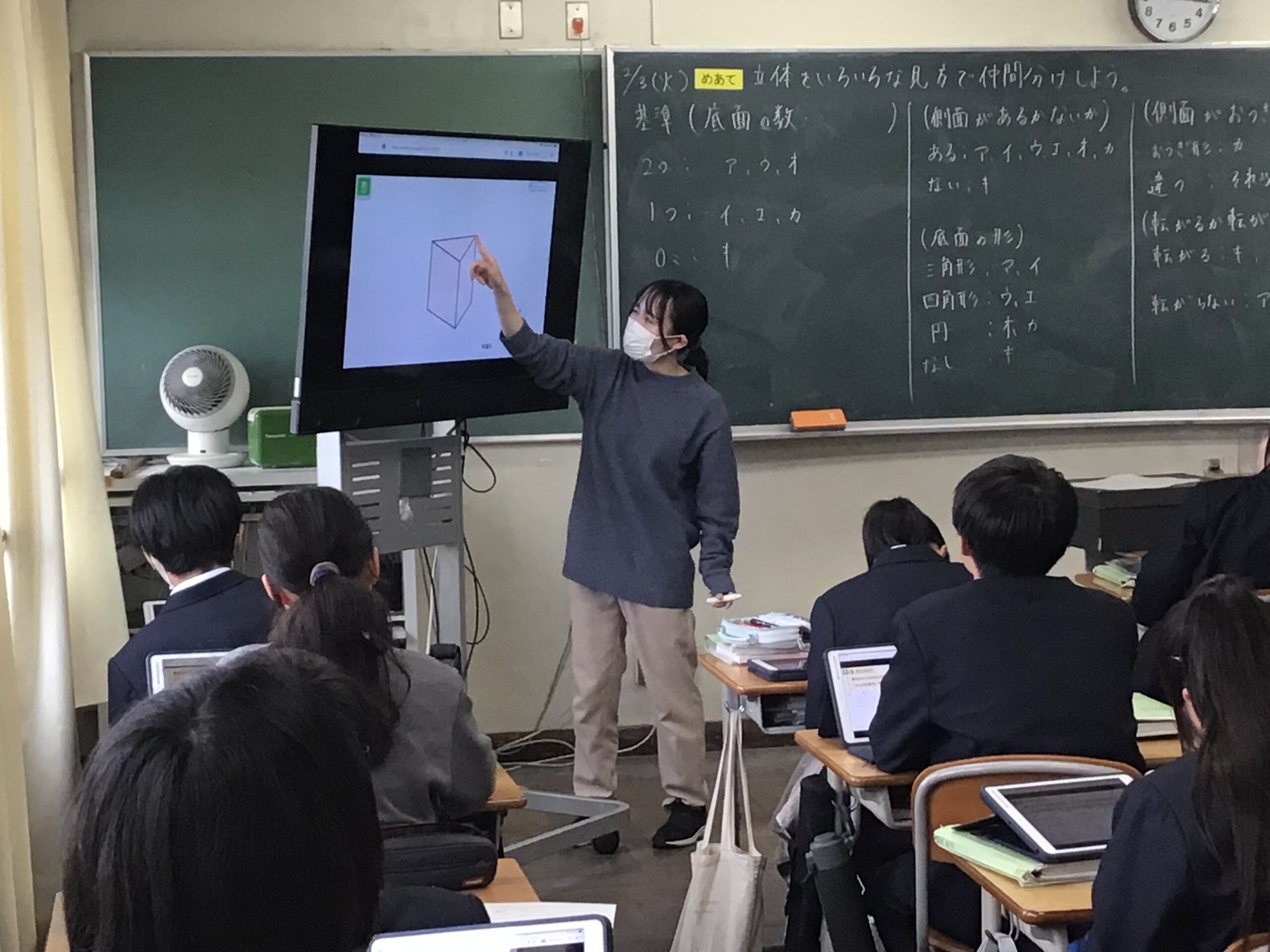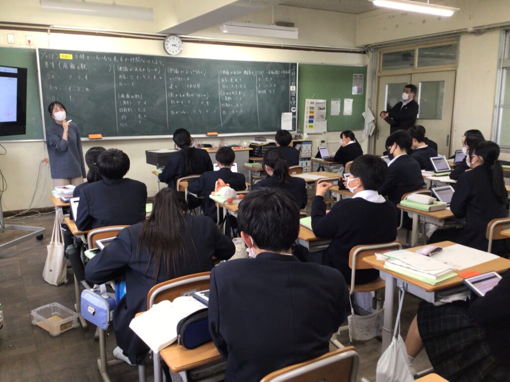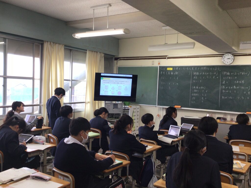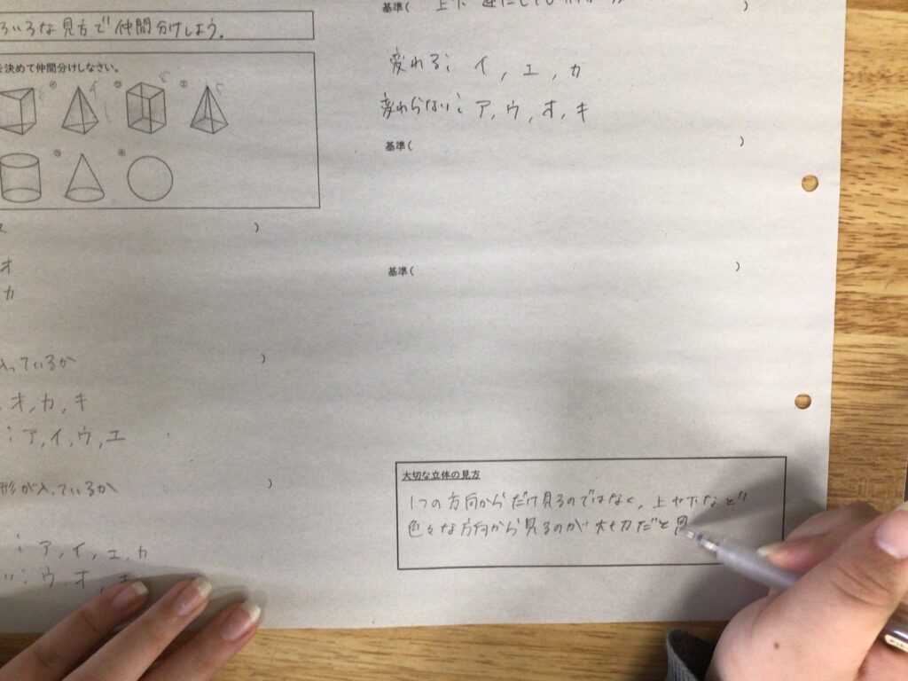 1年の数学では、空間図形の単元で、 立体を通して「ものごとをいろいろな角度から見ることができる力」を 身に付けたい資質能力にすることを目標に授業をしました。 本時のミッションは、目の前にある様々な立体を「仲間分け」することです。 ただし、先生から「こう分けなさい」という指示はありません。 「面の数」で分けるのか、「真上から見た形」で分けるのか、あるいは・・・ 生徒自身が立体をぐるぐると回して観察しながら、 自分なりの「分類の基準」を見つけ出す課題に挑み、 1つの立体も、見る方向が変われば、 全く違う形に見えることを実感する授業となりました。