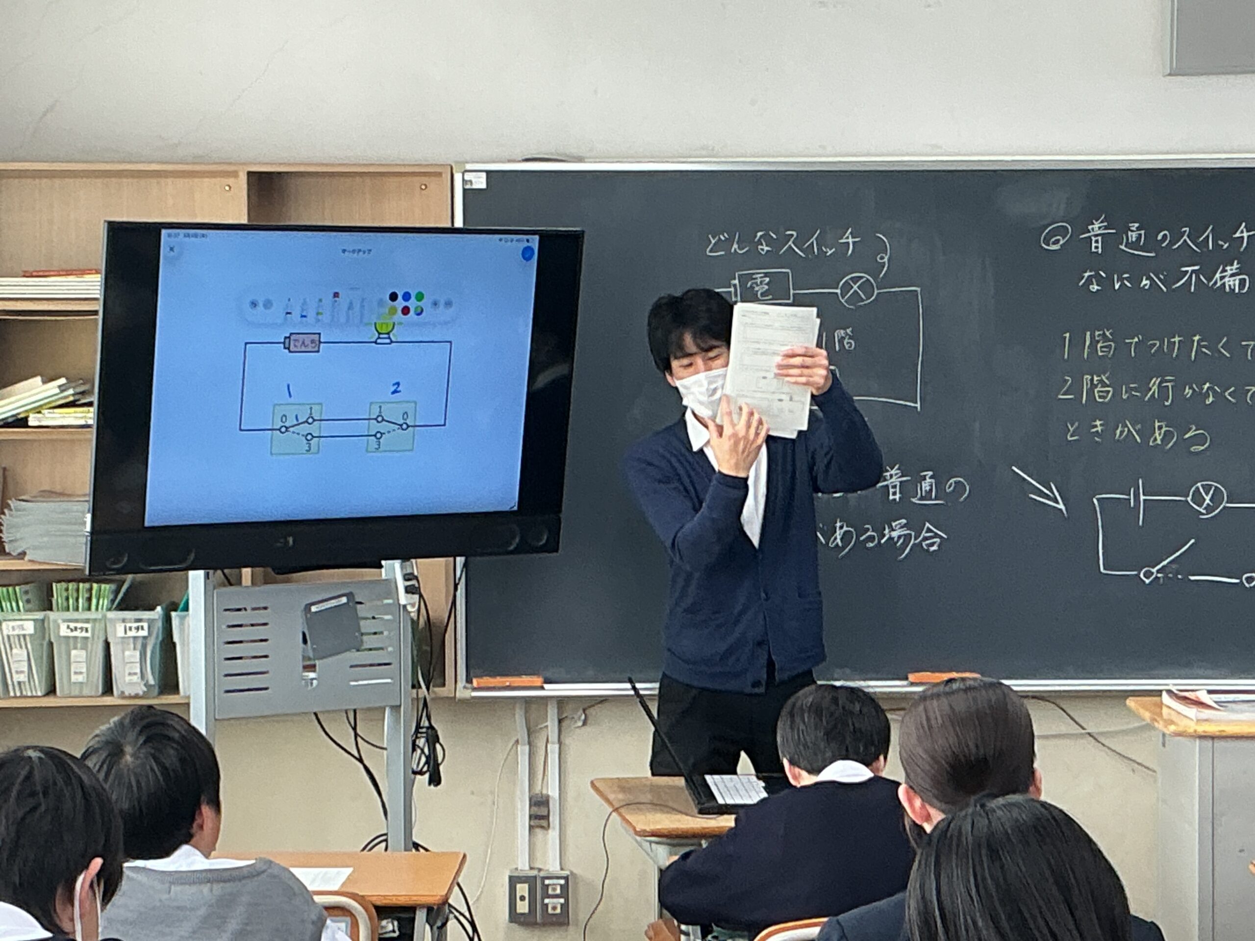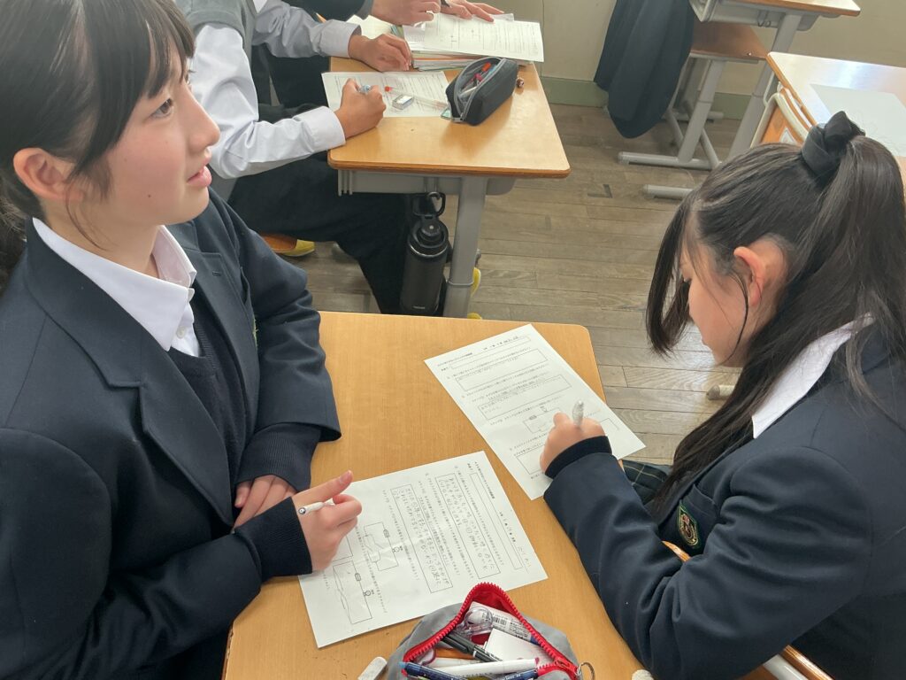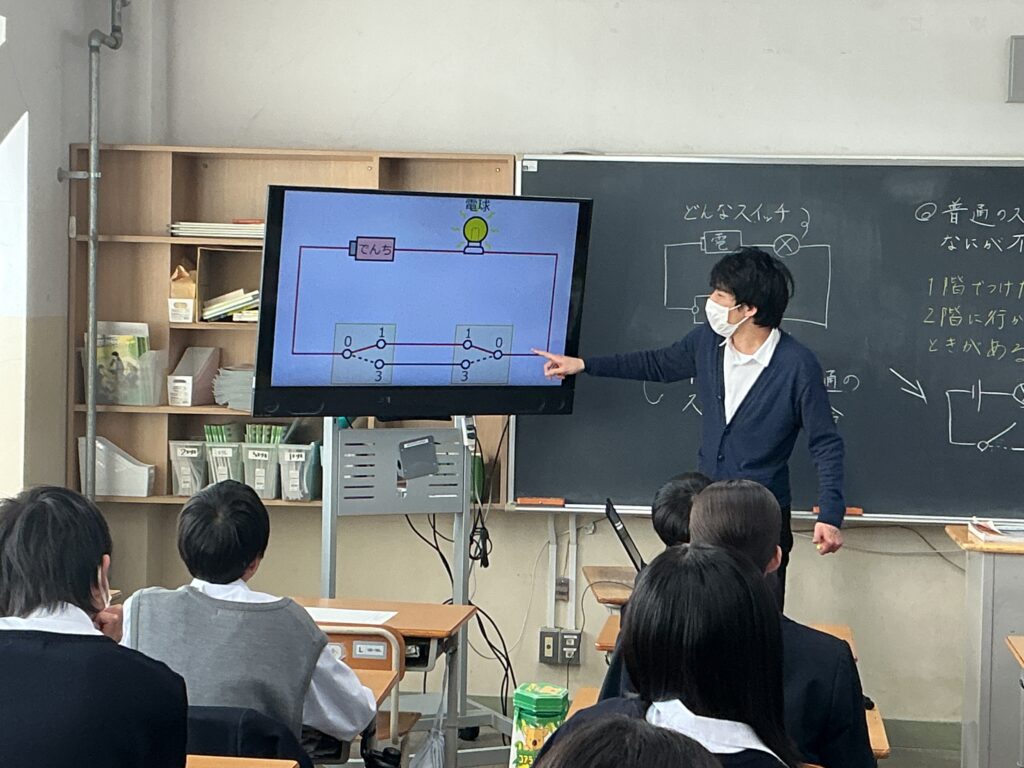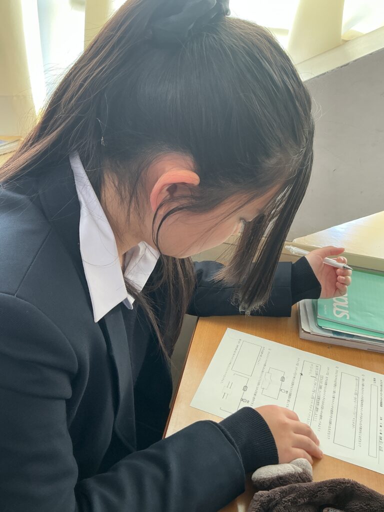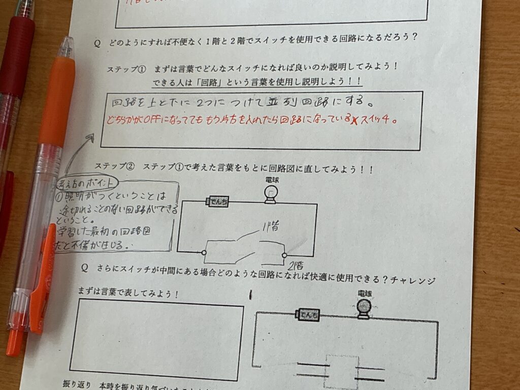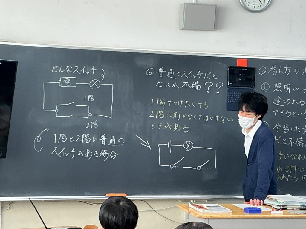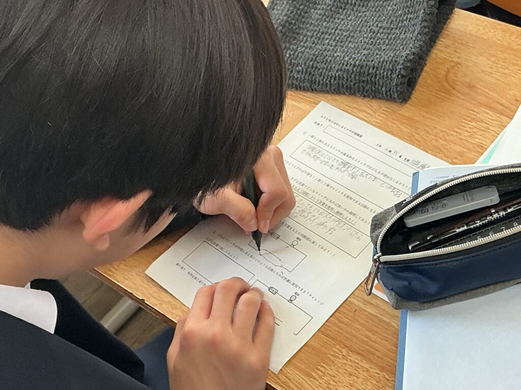 2年生の理科の授業では、「電流が流れる道すじ」の単元のまとめとして、 私たちの日常生活に直結する授業が行われました。 本授業の学習課題は、「家の階段などにある、1階でも2階でも点けたり 消したりできる照明は、一体どんな回路になっているのだろう?」です。 ただの「入り・切り」のスイッチでは、1階で電気を消して2階に上がった後、 次に1階にいる人が電気を点けられず不便になってしまいます。 この日常の「不便」を解消する魔法のようなスイッチの仕組みを、 これまで学んできた直列回路・並列回路の知識を総動員して考えました。 まずは個人でじっくりと回路図と向き合い、その後グループになって お互いの考えを発表し合いました。 「ここがこう繋がれば、こっちを切っても電気が流れるんじゃない?」 「ああっ!そういうことか!」 友達の意見を聞いたり先生と話すことで 解決策が見え、教室のあちこちから嬉しそうな声が上がっていました。 学校で学んだ理科の知識が、実は私たちの毎日の便利な生活を支えている。 そんな「科学の面白さ」と、仲間と協働して答えを導き出す 「学ぶ楽しさ」を味わうことができた2年生でした。