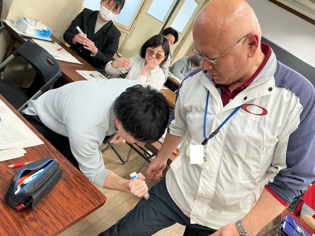 もう1つの校内研修は、生徒の皆さんが毎日を安心・安全に過ごせるよう、 毎年実施している全教職員を対象とした「エピペンの正しい使用方法と緊急時の対応」 についての校内研修を養護教諭の指導のもと実施しました。 アナフィラキシーショックの基本的な知識や症状の進行について全体で学びました。 アレルギー症状はいつ、誰に、どのような形で起こるか分かりません。 初期症状を見逃さず、迅速に判断するためのポイントを全職員で再確認しました。