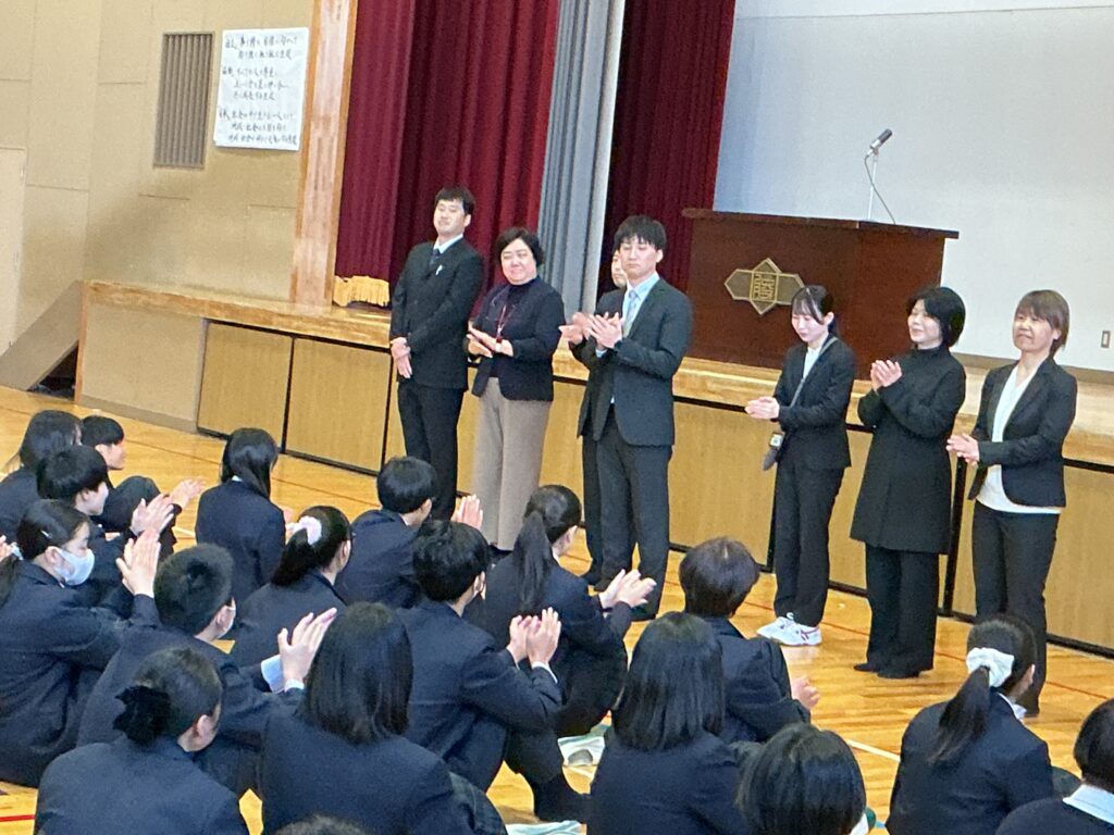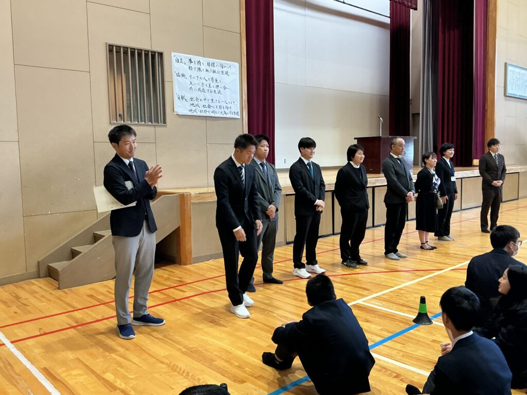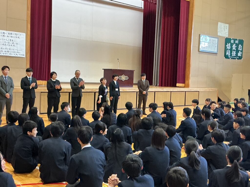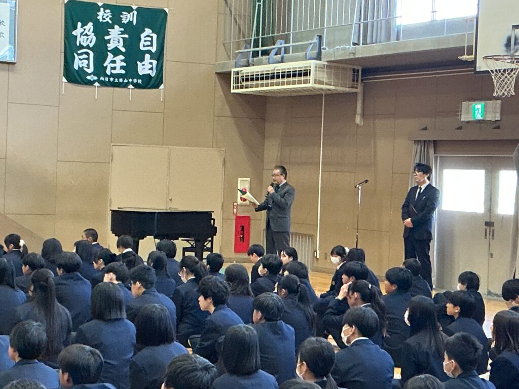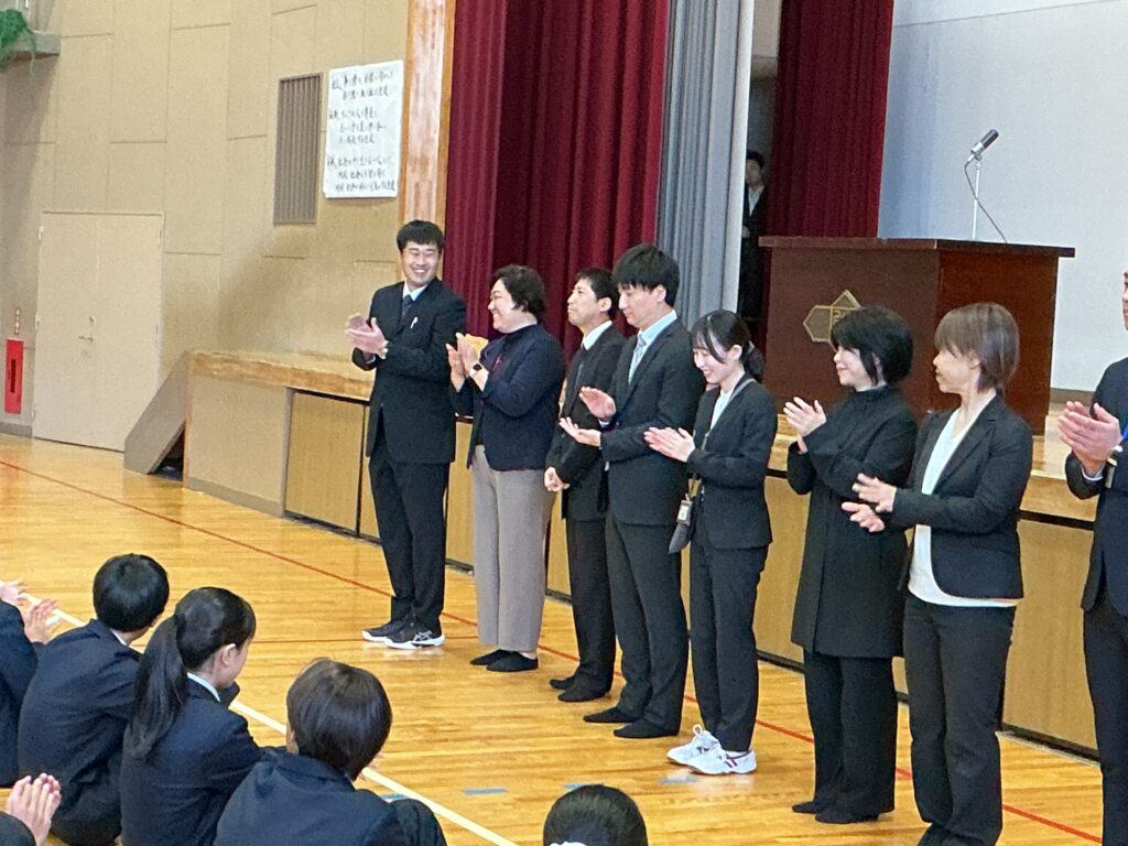 今日は4月8日、着任式・始業式を行いました。 まずは、着任式、新たに8人の先生方を温かい雰囲気で迎えました。 次に、始業式、校長先生から各学年へのエールが送られました。 「3年は、いよいよ最高学年となります。 みなさんが勝山中学校の”顔”として“代表”として、目標を持って粘り強く、 何事も前向きに頑張って、進路にも向き合ってください。」 「2年は、いよいよ先輩になります。新入生が安心して過ごせるよう、 小さな変化を気づき、その時にはさりげない優しさで そっとフォローできるみなさんであってください。」 そして、生徒会会長が壇上にあがって校長先生からの直接インタビュー。 「今の勝山中のいいところ」を生徒会会長から紹介してもらいました。 生徒会会長からは、「やると決めたらとことんやりきるところ」と 良さを発表してもらい、勝中生から承認の拍手が起こっていました。 その後、最も盛り上がりを見せたのが職員紹介と担任発表です。 発表のたびに、体育館には驚きの声と温かい歓声が入り混じり、 新しい出会いを楽しむ勝中生のエネルギーを感じる瞬間となりました。 最後に、生徒指導の先生から「新しい勝山中を共に創ろう」とありました。