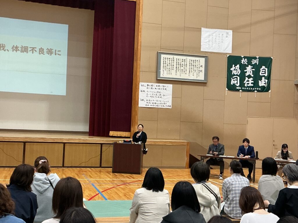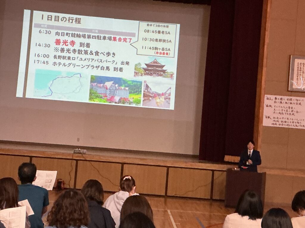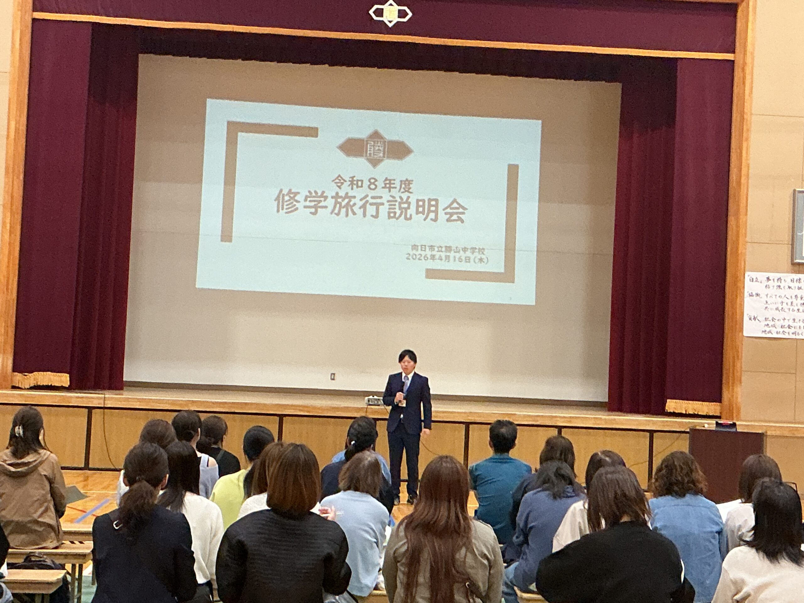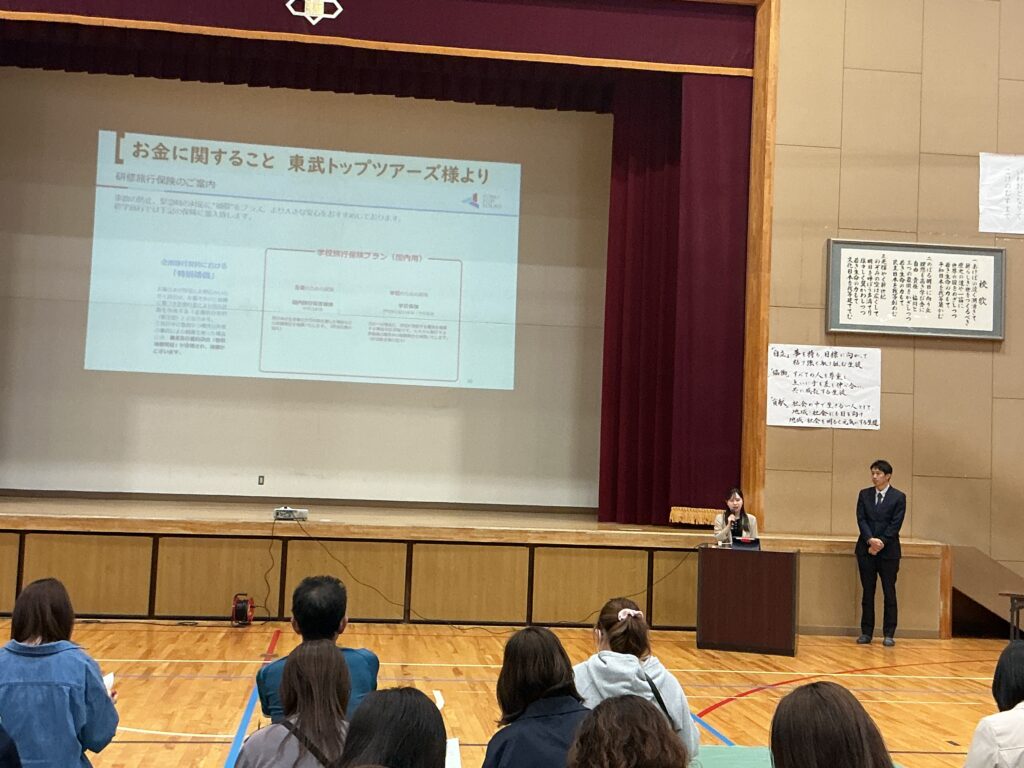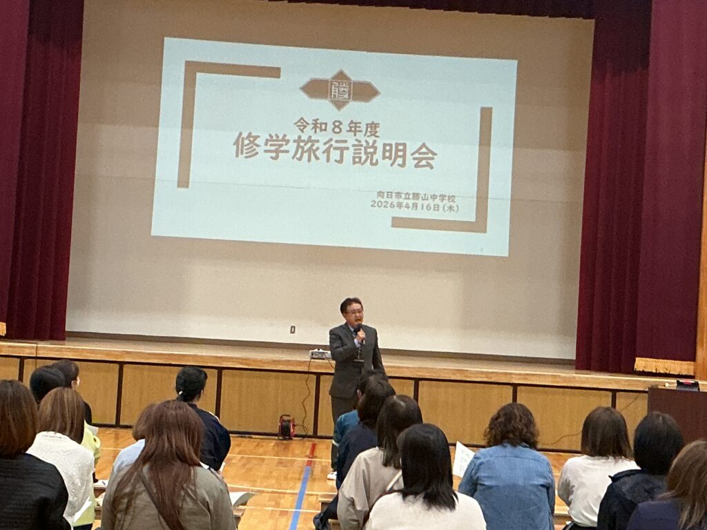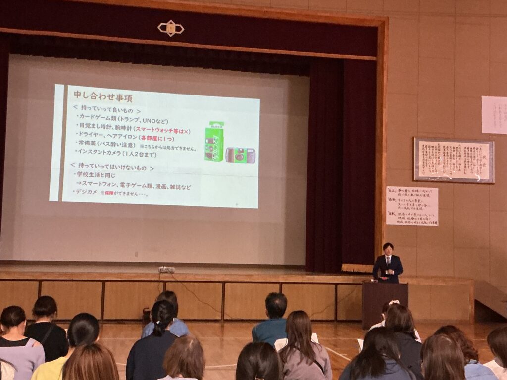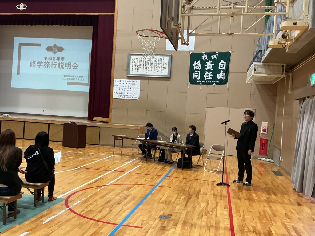 16日に、本校体育館にて3年生の保護者を対象とした「修学旅行説明会」を 開催いたしました。お忙しい中、100名近い保護者の皆様にご出席いただき、 誠にありがとうございました。 学年主任より、行程一つひとつの意味を理解し、最高の思い出を自分たちの手で 創り上げるための準備について詳しく説明を行いました。 続いて、旅行会社様からは申し込み手続きや保険等の事務的な内容について、 また、本校の養護教諭からは、旅先での急な体調不良や不測の事態に備えた 健康管理・対応体制について詳しくお伝えしました。 何よりも優先されるべきは、170名の生徒全員の「安心・安全」です。 学校、旅行会社、そしてご家庭と連携をしながら、 万全の体制で当日を迎えられるよう準備を進めてまいります。 今後とも、本校の教育活動へのご理解とご協力をよろしくお願いいたします。