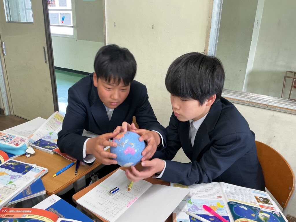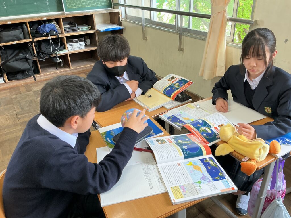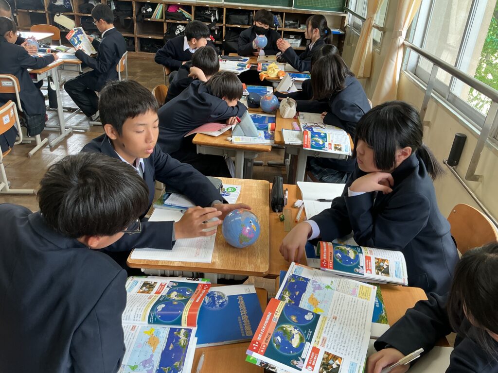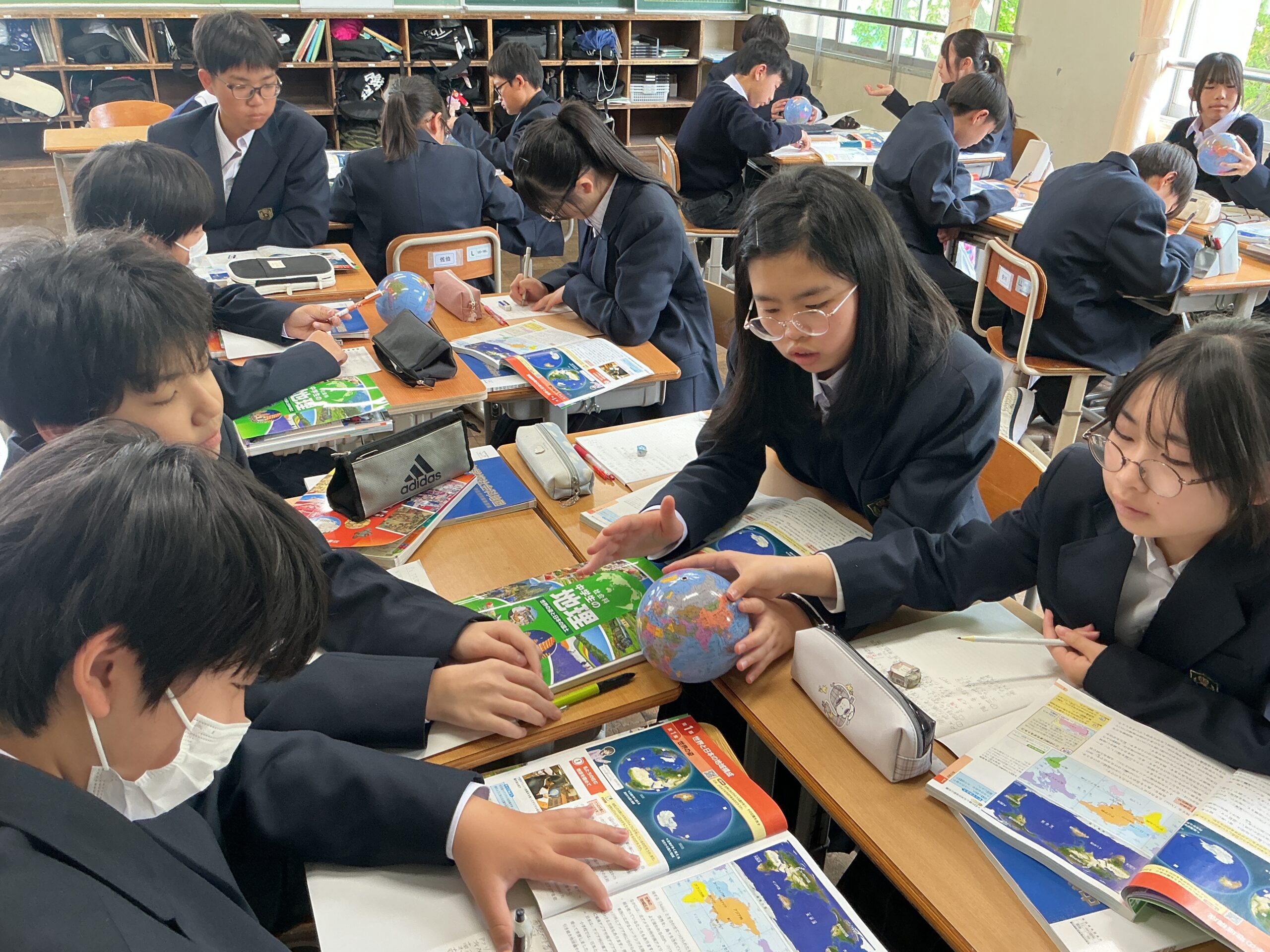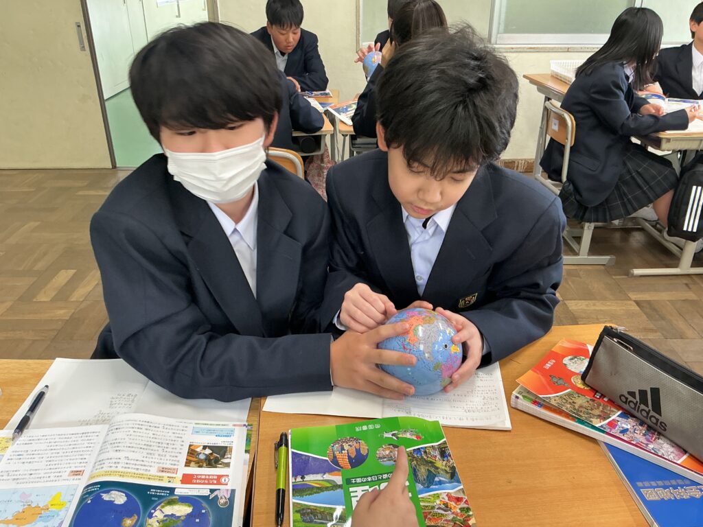 1年生の社会科では、地理的分野「世界の姿」の学習がスタートしました。 授業冒頭では、この単元のゴールである 「自分で特徴のある国を1つ選び、 その位置を緯度・経度を使って正確な数値で示そう!」 というゴールの姿が示されました。 ゴールに到達するためには、「世界がどんな姿をしているのか知らなあかん」 という発言から「特徴のある国ってどんな国?」 「面積や人口がすごい国があるのかな?」「緯度や経度ってどうやって測るの?」と、 自分たちで解決すべき課題について見通しを立てて学習を始めました。 グループごとに地球儀をじっくりと眺め、大陸と大洋の分布を調査しました。 「陸と海では海の方が圧倒的に広い!」発見したことを 次々とノートにメモしていきました。 単元の終盤には、自分で選んだ「特徴のある国(=推し国)」を 正確に紹介する活動に入ります。 そのためには、次の授業で特徴のある国探しをしようと確認して終わりました。 これから始まる世界の国々の探究に向けて、スタートを切った1年のみなさんです。