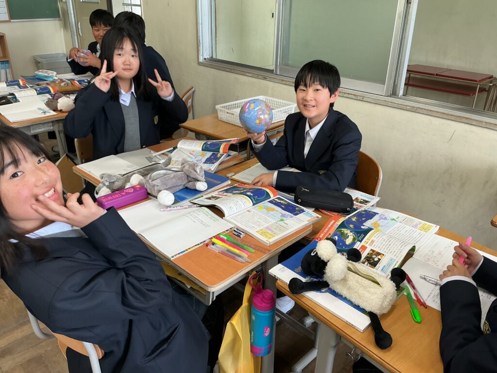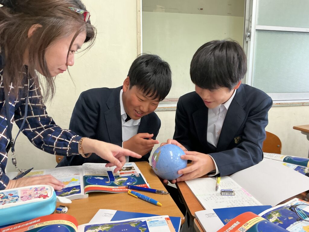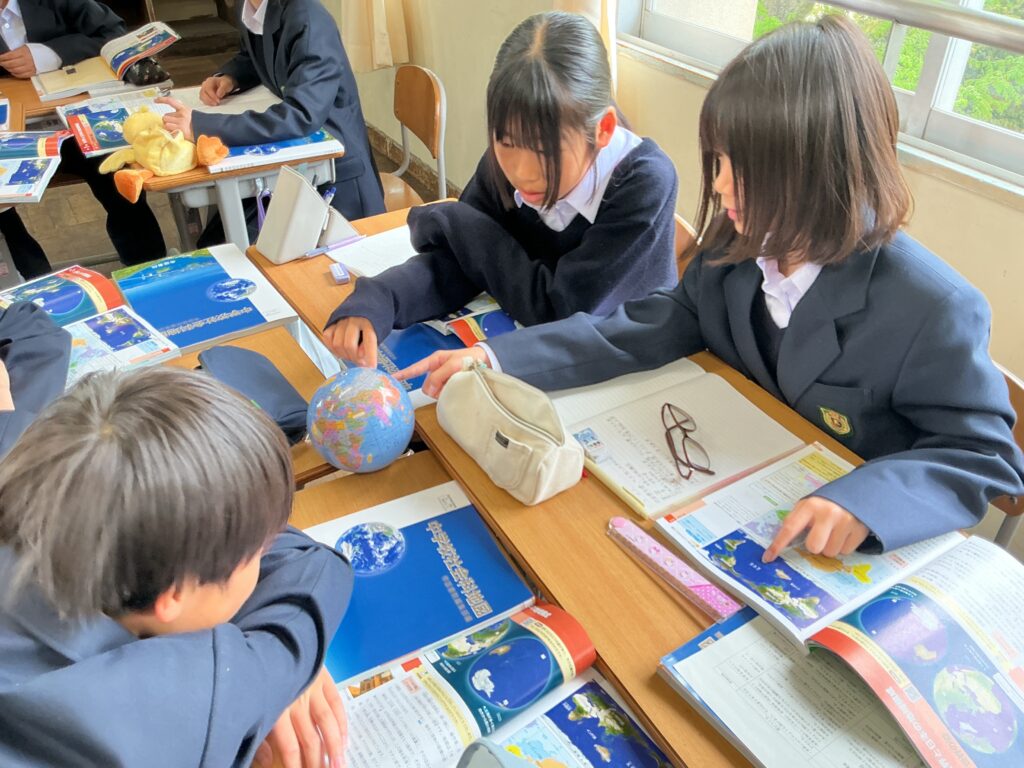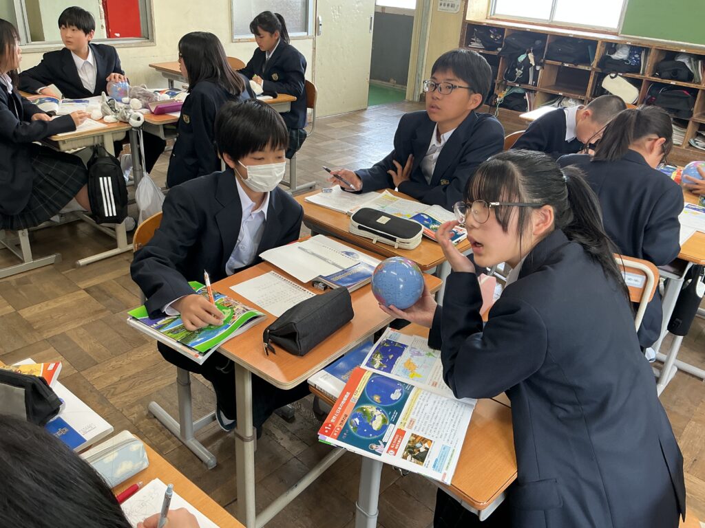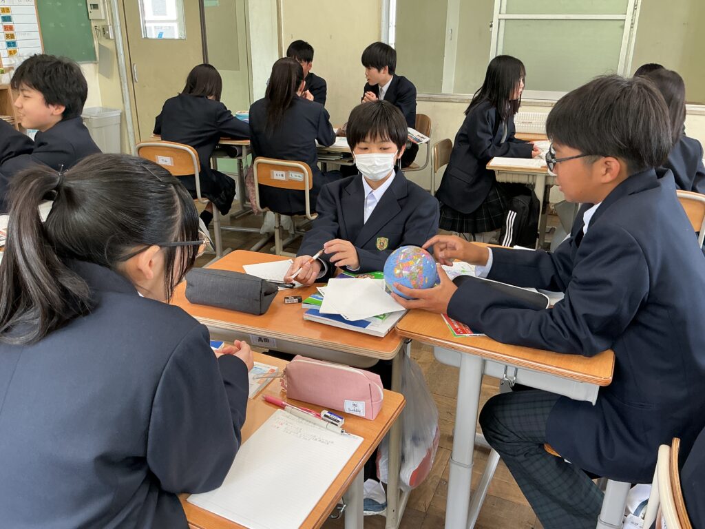 1年生の社会科では、地理的分野「世界の姿」の学習がスタートしました。 授業冒頭では、この単元のゴールである 「自分で特徴のある国を1つ選び、 その位置を緯度・経度を使って正確な数値で示そう!」 というゴールの姿が示されました。 ゴールに到達するためには、「世界がどんな姿をしているのか知らなあかん」 という発言から「特徴のある国ってどんな国?」 「面積や人口がすごい国があるのかな?」「緯度や経度ってどうやって測るの?」と、 自分たちで解決すべき課題について見通しを立てて学習を始めました。 グループごとに地球儀をじっくりと眺め、大陸と大洋の分布を調査しました。 「陸と海では海の方が圧倒的に広い!」発見したことを 次々とノートにメモしていきました。 単元の終盤には、自分で選んだ「特徴のある国(=推し国)」を 正確に紹介する活動に入ります。 そのためには、次の授業で特徴のある国探しをしようと確認して終わりました。 これから始まる世界の国々の探究に向けて、スタートを切った1年のみなさんです。