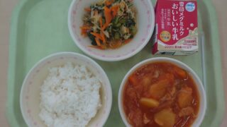 今日の給食 9月19日の給食 ☆ごはん☆パワーアップトマト煮込み☆小松菜とキャベツの和え物☆牛乳 今日は食育の日の献立でした。今月は、「カービィ」が大好きな、トマトがたくさん入ったパワーアップトマト煮込みです。「トマトが赤くなると医者が青くなる」ということわざが... 2025.10.01 今日の給食
