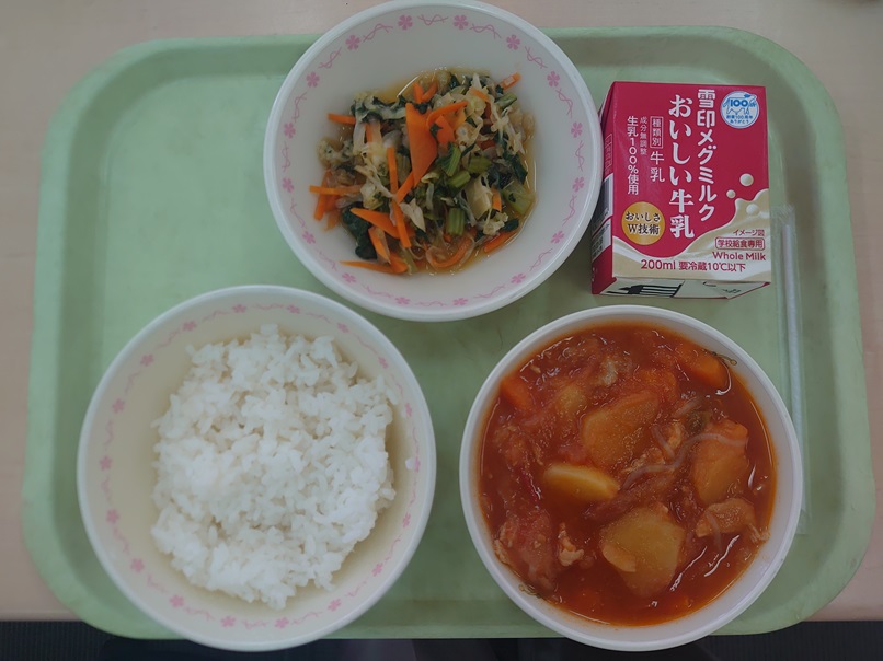 9月19日の給食 今日の給食 2025.10.01 ☆ごはん☆パワーアップトマト煮込み☆小松菜とキャベツの和え物☆牛乳 今日は食育の日の献立でした。今月は、「カービィ」が大好きな、トマトがたくさん入ったパワーアップトマト煮込みです。「トマトが赤くなると医者が青くなる」ということわざがあります。特に注目なのが、トマトの赤い色のもとになっているリコピンという色素です。リコピンには、夏の強い紫外線から肌を守る効果があるといわれています。 Post Views: 21