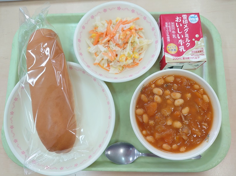 9月24日の給食 今日の給食 2025.10.01 ☆ミルクパン☆ポークビーンズ☆コールスローサラダ☆牛乳 ポークビーンズの「ポーク」は豚肉、「ビーンズ」の豆という意味で、豚肉と、大豆、野菜を煮込んだ料理です。大豆は「畑の肉」といわれるほど栄養価が高く、体の筋肉や血をつくるもとになる「たんぱく質」を豊富に含んでいます。アメリカでは、大豆を「黄金の大地」と呼んでいるそうです。 Post Views: 20