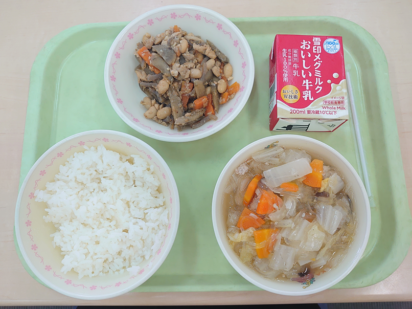 10月3日の給食 今日の給食 2025.10.03 ☆ごはん☆肉団子のスープ煮☆お豆のきんぴら☆牛乳 肉団子のスープ煮に入っている肉団子は、調理員さんの手作りです。ひき肉に玉ねぎ、生姜、調味料を入れてこね、一口サイズに丸めます。玉ねぎの水分がでることでふんわりとやわらかい肉団子に仕上がります。 Post Views: 15