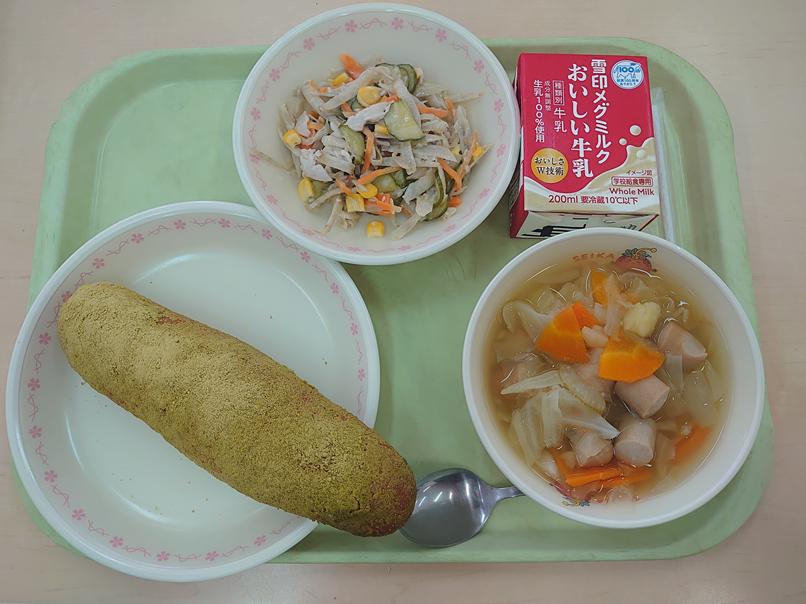 10月8日の給食 今日の給食 2025.10.092025.10.08 ☆抹茶揚げパン☆ポトフ☆ごぼうサラダ☆牛乳 給食で人気のメニューのひとつ、揚げパンにはいろいろな味があります。きなこパンや抹茶揚げパン、ココア揚げパンなどが給食に出てきます。抹茶だけでは苦いので、今日はきなこと砂糖を抹茶に混ぜています。ほんのりお茶の香りがする揚げパンを味わいました。 Post Views: 19