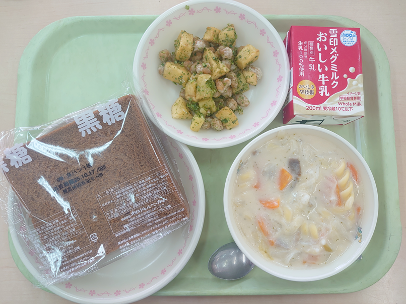 10月15日の給食 今日の給食 2025.10.15 ☆黒糖パン☆マカロニのクリーム煮☆ポテトビーンズのり塩味☆牛乳 今日は、食育の日献立です。今月は、ちいかわに登場する「ハチワレ」が大好きな、のりがたくさん入った「ポテトビーンズ」です。青のりは、海で育つ海藻からできています。細かくして乾かすと、とてもよい香りがする粉になります。栄養素も豊富で、カルシウムやビタミンがたっぷり入っています。 Post Views: 12