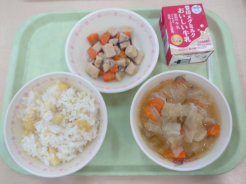 10月16日の給食 今日の給食 2025.10.16 ☆さつまいもごはん☆高野豆腐の含め煮☆キャベツのみそ汁☆牛乳 高野豆腐は、豆腐を凍らせ、低い温度で寝かせた後に乾燥して作る保存食です。乾燥していると、硬いスポンジのようですが、水で戻すと水を含んで重さは6倍にもなり、やわらかくなります。体を作るたんぱく質やカルシウム、貧血を防ぐ鉄分、お腹をきれいにする食物繊維など、豆腐の栄養がぎゅっと詰まっています。 Post Views: 7
