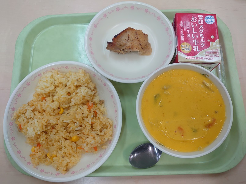 10月31日の給食 今日の給食 2025.11.04 ☆カレー風味のトマトライス☆マスタード焼き☆かぼちゃポタージュ☆牛乳 ハロウィンは、ヨーロッパで生まれた行事です。ランタンにかぼちゃが使われていますが、もともとはカブを使っていたそうです。しかし、ヨーロッパからアメリカへ伝わった時に、アメリカではカブの生産量が少ないことから、収穫の多いかぼちゃになりました。かぼちゃがたっぷりと入ったポタージュで行事食を楽しみました。 Post Views: 61