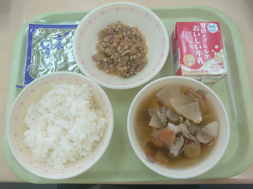 11月10日の給食 今日の給食 2025.11.11 ☆ごはん☆肉みそ納豆☆手巻きのり☆のっぺい汁☆牛乳 納豆は、蒸した大豆にナットウ菌をつけて発酵させたものです。給食では、ひき肉やねぎと一緒にひきわり納豆を炒め、赤みそやトウバンジャンなどで味付けします。手巻きのりにその具とごはんを一緒にのせて食べます。納豆が苦手でも食べやすい味付けになっています。 Post Views: 11