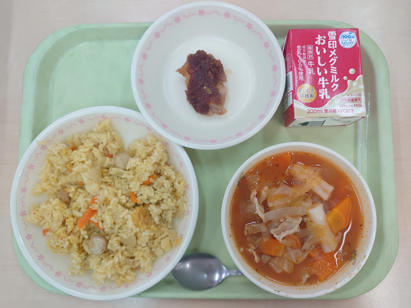 11月18日の給食 今日の給食 2025.11.21 ☆カレーピラフ☆バーベキューチキン☆ミネストローネ☆牛乳 今日は、精華中学校のリクエストでカレーピラフにしました。ピラフとチャーハンの違いを知っていますか。チャーハンはご飯を炒めて作り、ピラフは生の米をそのまま炒めて作るところが大きな違いです。ピラフはトルコ料理として有名ですが、ヨーロッパやアジアの国で多くのひとたちに親しまれている料理です。 Post Views: 1