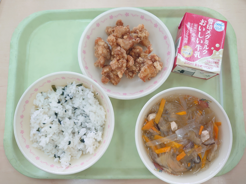 11月28日の給食 今日の給食 2025.12.01 ☆わかめごはん☆とり肉のからあげ☆春雨スープ☆牛乳 今日は、3つの中学校で人気だったメニューを組み合わせました。春雨は緑豆やじゃがいもなどのでんぷんから作られ、麵状にして乾燥させているため、長期保存ができます。料理に使う時は水で戻して、加熱して使います。炒めたり、スープに入れたり今日の給食のようにサラダにもできる食材です。ツルツルとした食感を味わって下さい。 Post Views: 10