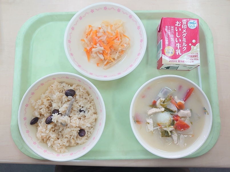 1月15日の給食 今日の給食 2026.01.15 ☆黒豆ごはん☆お雑煮☆大根のさっぱり和え☆牛乳 おせちのひとつひとつの料理には、1年の始まりを祝う、縁起の良い意味や願いが込められています。今日の黒豆ごはんの黒豆には、「マメに働く」という意味があります。また雑煮は地域で味やおもちの形が違います。給食は白みそ仕立ての京都のお雑煮です。白玉が入っているので、よくかんで食べましょう。 1.15ダウンロード Post Views: 3