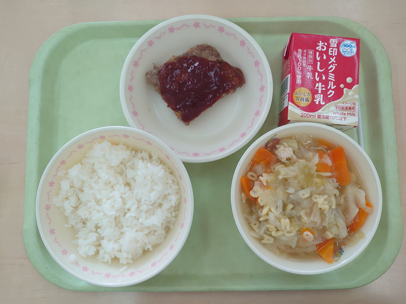 1月19日の給食 今日の給食 2026.01.28 ☆ごはん☆まる子のごちそうハンバーグ☆ABCスープ☆牛乳 今日は食育の日献立です。今月は、ちびまる子ちゃんに登場するまる子の好きな「ハンバーグ」です。こねたお肉を丸めず、鉄板に広げて焼き、四角くカットした調理員さんの手作りの特製ハンバーグです。 Post Views: 22