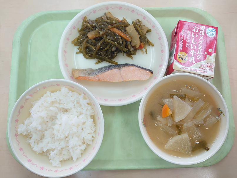 1月27日の給食 今日の給食 2026.01.29 ☆ごはん☆鮭の塩焼き☆茎わかめのきんぴら☆大根のみそ汁☆牛乳 給食週間2日目は、塩味を味わう献立です。茎わかめそのものにも塩味がありますが、味付けに使うしょうゆは、甘みやうま味など様々な風味が溶け込んでいます。そのため、しょうゆを加えることで、茎わかめの塩味がまろやかになり、豊かな味わいに仕上がります。 Post Views: 11