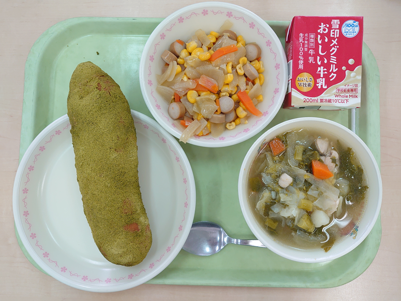 給食週間3日目は、苦みを味わう献立です。花菜は、菜の花を食べられるように改良したものです。花が咲いてしまう前の「つぼみ」のときに食べると、ちょうどよい苦みで美味しいです。苦い味は、大人よりもこんにちは子どものほうが強く感じるといわれています。しかし、苦い食べ物も何度か食べるうちに「おいしい」と感じることが増えてきます。苦みが苦手な人も、料理や調理法によっても食べやすくなるため、苦手と決めつけず、一口食べてみると「おいしい」発見ができます。