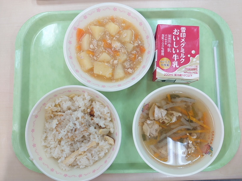4月23日の給食 今日の給食 2026.04.28 ☆たけのこごはん☆じゃがいものそぼろ煮☆沢煮椀☆牛乳 精華町でとれたたけのこを使った、たけのこごはんです。水煮にされたものもありますが、たけのこは春が旬の食材で、生のたけのこが味わえるのはこの時期だけです。土の上に芽が出てからの成長がとても早く、十日ほどで立派な竹になります。 Post Views: 4
