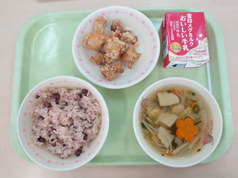 4月28日の給食 未分類 2026.04.28 ☆赤飯☆とり肉の唐揚げ☆かまぼこのすまし汁☆牛乳 1年生の入学お祝いと進級お祝い献立です。日本では昔から誕生日や結婚式などお祝い事があると「赤飯」を炊いて、ごちそうする習慣があります。給食室で小豆を炊いて、小豆の煮汁も一緒に米を炊くことでご飯に赤い色をつけます。 Post Views: 2