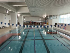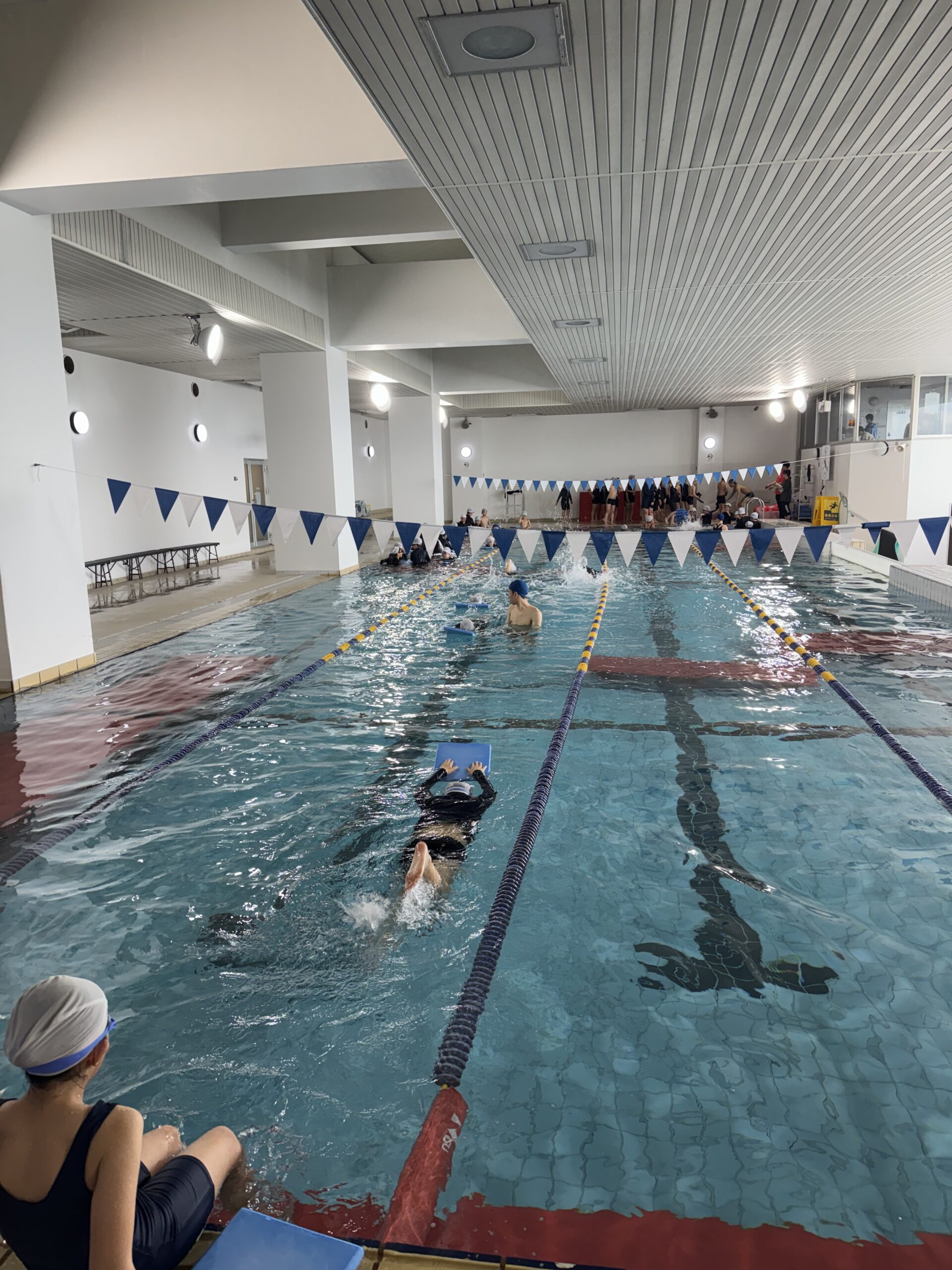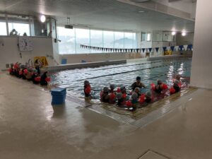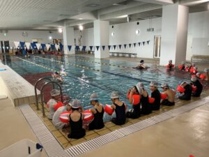 プールは4コースあり、コパンスポーツクラブの先生に指導していただきます。今日は5名の先生がグループに分かれて指導いただきました。子どもたちは自分の泳力を伸ばすために、楽しみつつも懸命に学習に取り組んでいました。