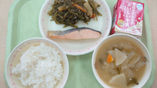 ☆ごはん☆鮭の塩焼き☆茎わかめのきんぴら☆大根のみそ汁☆牛乳 給食週間2日目は、塩味を味わう献立です。茎わかめそのものにも塩味がありますが、味付けに使うしょうゆは、甘みやうま味など様々な風味が溶け込んでいます。そのため、しょうゆを加...