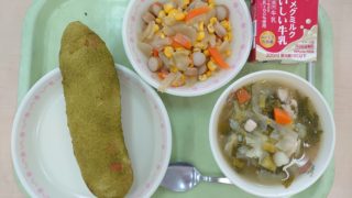☆抹茶揚げパン☆花菜のスープ煮☆コーンソテー☆牛乳 給食週間3日目は、苦みを味わう献立です。花菜は、菜の花を食べられるように改良したものです。花が咲いてしまう前の「つぼみ」のときに食べると、ちょうどよい苦みで美味しいです。苦い味は、...
