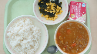 ☆麦ごはん☆きらきらポークカレー☆わかめとコーンのサラダ☆牛乳 わかめは、「海の野菜」ともいわれるように、野菜と同じく体の調子を整えるはたらきがあります。わかめは、ヌルヌルしているのが特徴です。このヌルヌルは、食物繊維で、体の中の余...