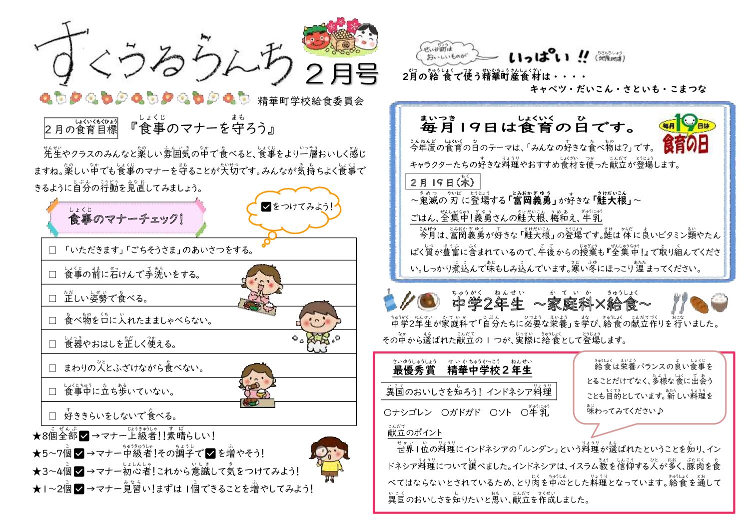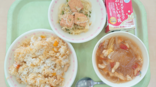 ☆ナシゴレン☆ガドガド☆ソト☆牛乳 今日は、精華中学校の2年生が家庭科の授業で考えた献立で、テーマは「異国の美味しさを知ろう!インドネシア料理」です。給食を通して異国の美味しさを知るためにこの献立を考えたそうです。ナシゴレンは、イン...