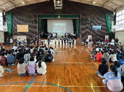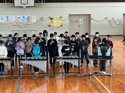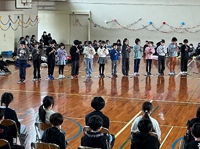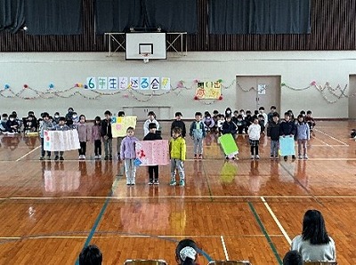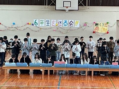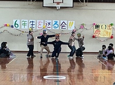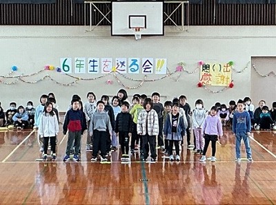 2月27日に5年生が中心になり計画や準備を進めてきた「6年生を送る会」を行いました。当日に向け、準備も各学年がとても張り切って進め、1・2・3年生が輪飾りや花飾りを作り、4・5年生が会場の飾り付けを行いました。当日はありがとうの気持ちを込めて温かいメッセージや歌、合奏などを6年生に届けることができました。6年生からも送る会への感謝の気持ちとしてメッセージと合奏が披露されました。全校遊びでは、じゃんけん列車を行い全校で楽しむことができました。これまで、いろいろな取組を引っ張ってくれたり、学校生活の中でたくさんのことを優しく教えてくれたりした6年生が大好きなことが伝わってくるとても温かい送る会となりました。