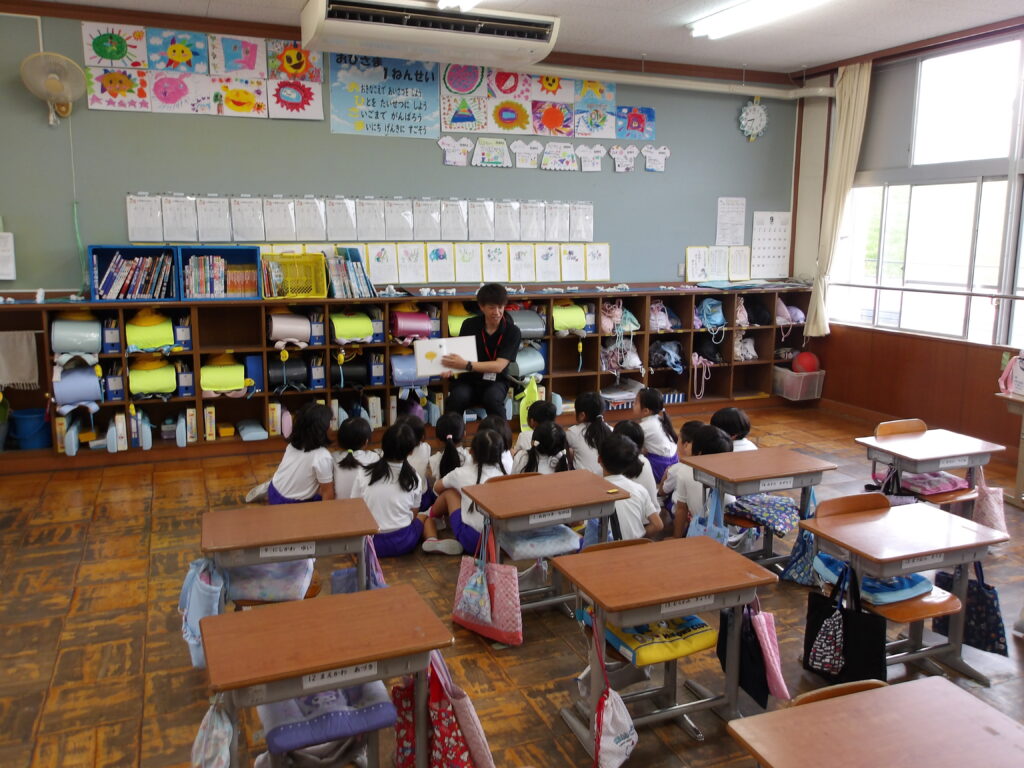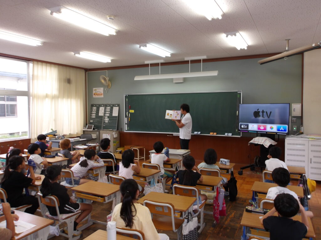 子どもたちが運動会で使用するトラックを中心に、「子どもの安全のため、子どもが精一杯競技に集合できるように!」という思いで、ここ数日毎日していただいています。地域の方々に支えられている吉美小学校です。本当にありがとうございます。 - 教師による本の読み聞かせ