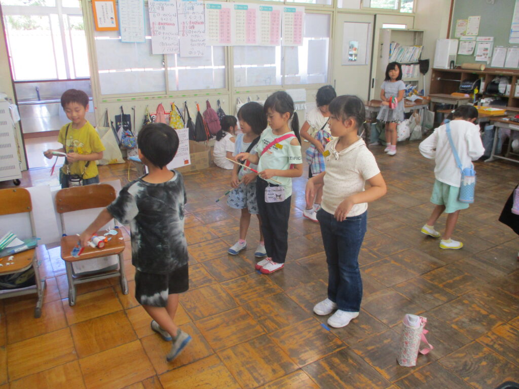 2年生が生活科「うごく うごく わたしのおもちゃ」の学習で作った風やゴムの力を使って動くおもちゃを1年生にも遊んでほしいと、「おもちゃランド」へ1年生を招待してくれました。