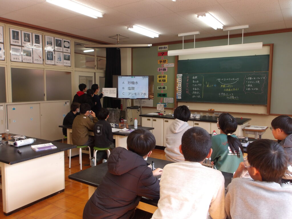 子どもたちは、課題の水溶液を比較して分かったことや何の水溶液かを特定するために必要な実験について等を班で話し合い・協働し、水溶液を蒸発させたり、匂いを嗅いだり、BTB溶液を使ったりしながら、学習したことを活かして実験を進めていました。