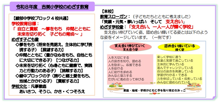 新1年生14名を迎え、今年度全校児童122名で令和8年度が始まりました。新しい学年、新しい教室、新しい先生との出会いに心を弾ませている子どもたちの「やる気いっぱい」の意欲をしっかりと受け止め、教職員も気持ちを新たにして、教育活動に取り組んでまいります。 昨年度末に子どもたちが考えた令和8年度のスローガン「笑顔・元気・夢いっぱい そして 支え合い」を活かして、今年度、吉美小学校がめざす学校は、「支え合い、一人一人が輝く学校」としました。子どもたちが元気に笑顔で学校生活を送り、仲間とともに支え合い、夢に向かって成長し続けること、そして、子どもたち一人一人の良さを認め合い、輝くことが実現できるよう、家庭・地域・学校がしっかりと手をつなぎ、教育活動を進めてまいりたいと考えています。4月に着任しました8名の教職員を含め23名の「新チームきみ」で頑張ります。保護者の皆様、地域の皆様には、本校の教育の推進につきましてご理解・ご支援を賜りますようどうぞよろしくお願いいたします。