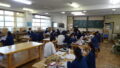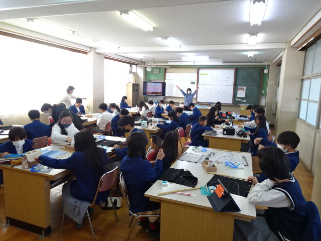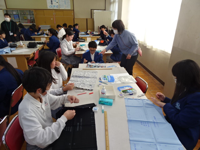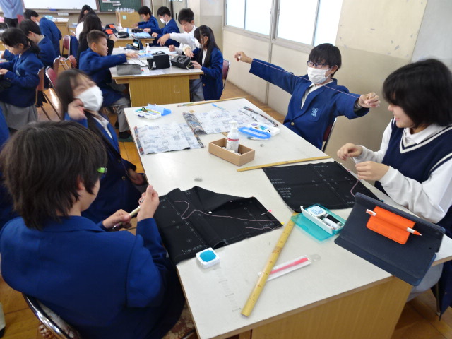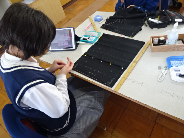 1年生家庭科の授業では現在ファイルカバー製作を実施しています。取材中はしつけ糸で縫う場面でしたが、針に糸を通す作業や玉結び、玉止めなどに40名近くが苦戦し、教員3名+1が巡回指導していましたが、それでもカオス状態でした…。みなさん家で練習しときましょうね(笑)