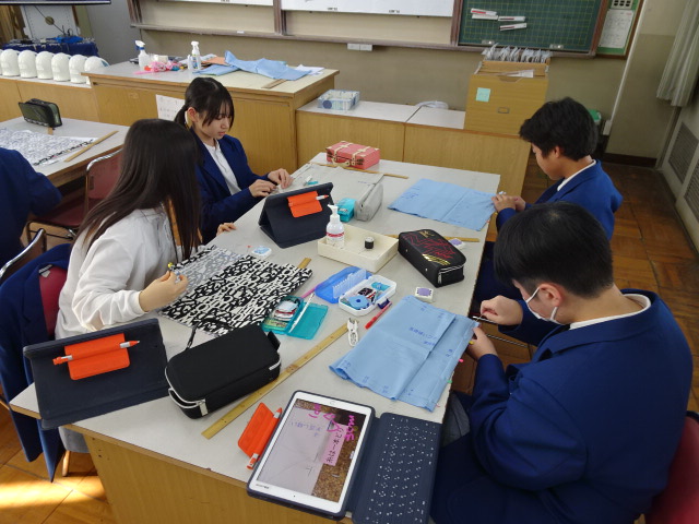 学校生活1年生家庭科の授業では現在ファイルカバー製作を実施しています。取材中はしつけ糸で縫う場面でしたが、針に糸を通す作業や玉結び、玉止めなどに40名近くが苦戦し、教員3名+1が巡回指導していましたが、それでもカオス状態でした…。みなさん家で練習しときましょうね(笑)