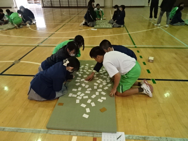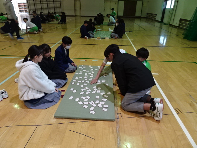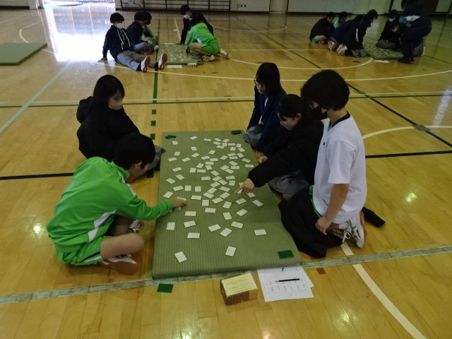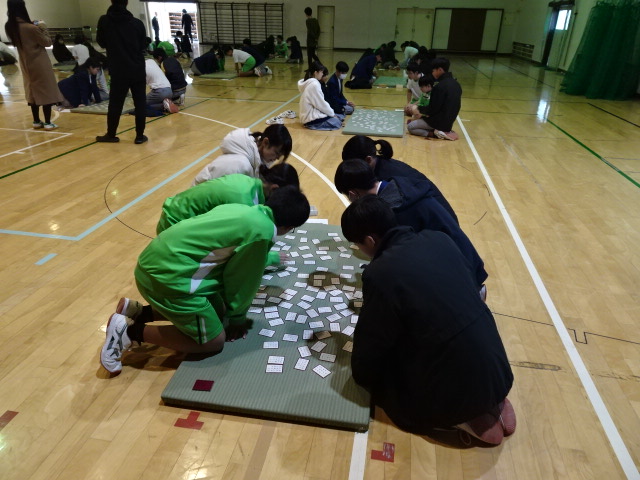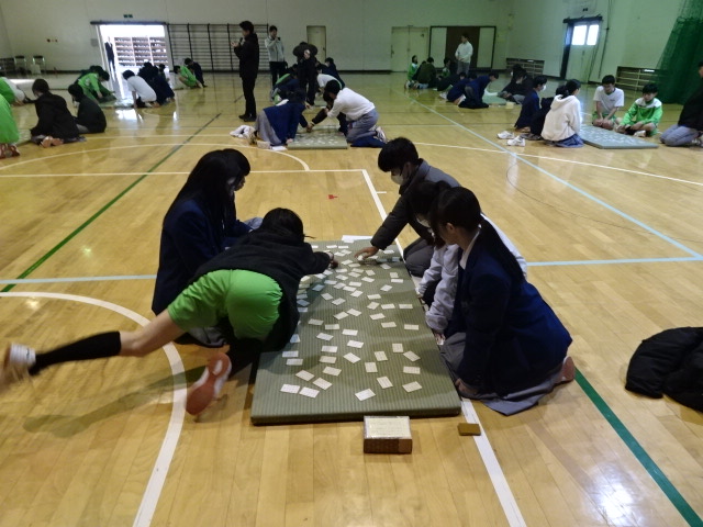 学校生活2年生は冬休みの宿題で百人一首を覚え、確認テストも無事終えたところで、実践編の百人一首大会を実施しました。昨年度も2回やったので、みんな手慣れた手つきで準備から運営までできました。詠み手はいろんな先生たちが交代で担当しましたが、詠み方がバラエティに富みすぎて一部集中が途切れる場面も…(笑) たぶん2027年もやりますよ。