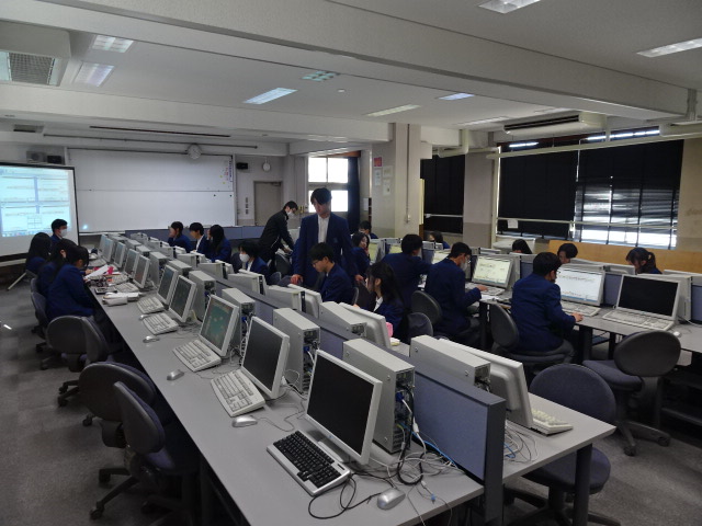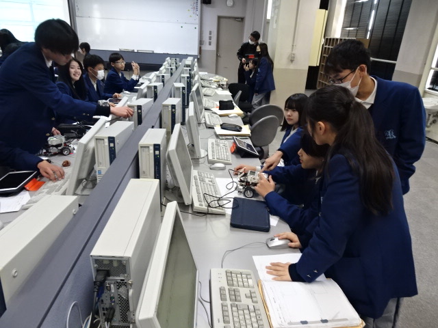 学校生活3年生技術の授業ではLEGO Educationを利用したプログラミングの授業を実施しています。ロボットにパソコン上から「タッチセンサーを押すごとに、24秒にリセットするカウントダウンし、0秒になったらブザー音を鳴らす」などの指令を出していました。ビジュアルだけ見れば私立学校のように見えます…